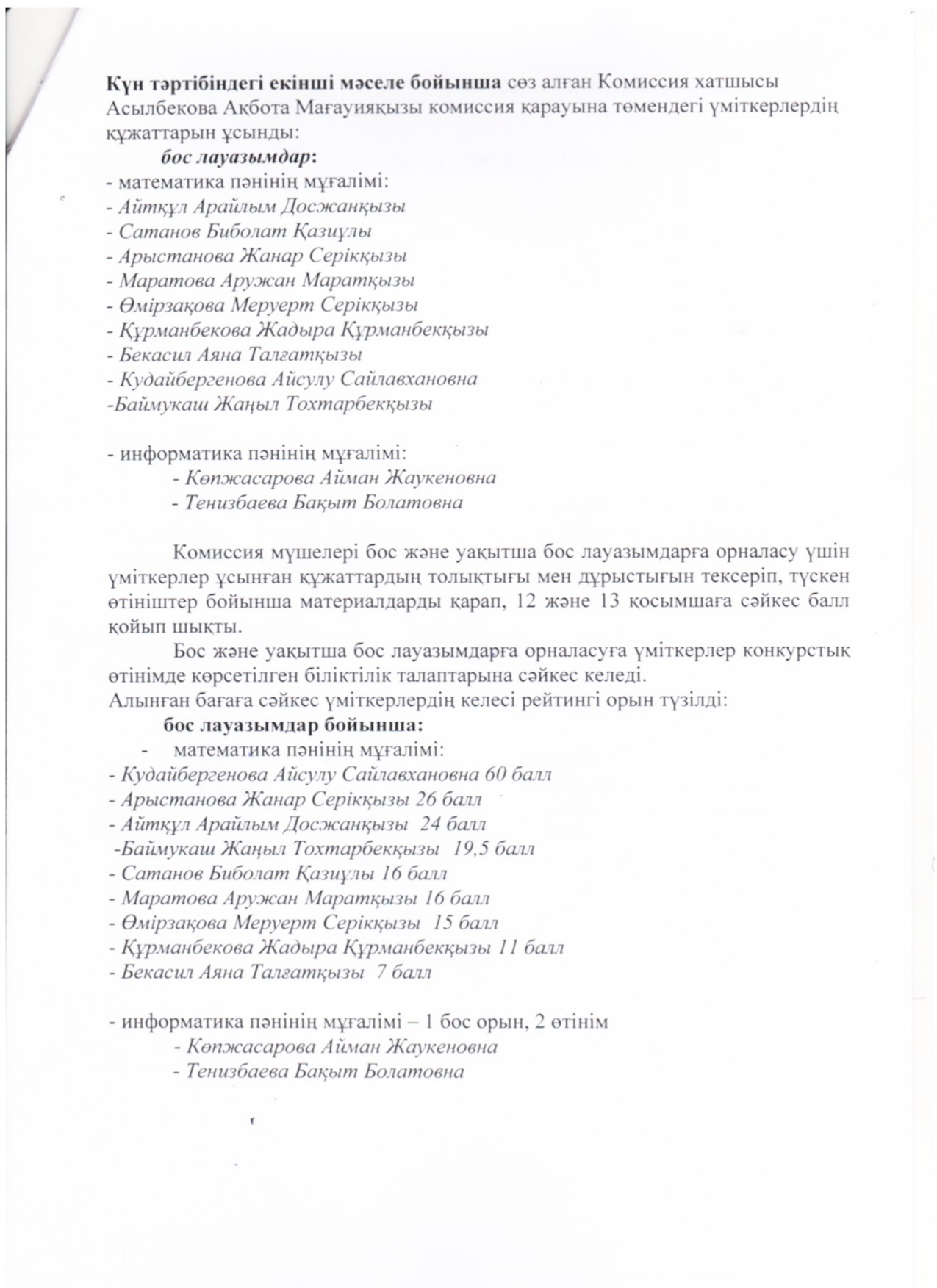 информатика пәні мұғалімі лауазымына 2 үміткер құжат тапсырды.