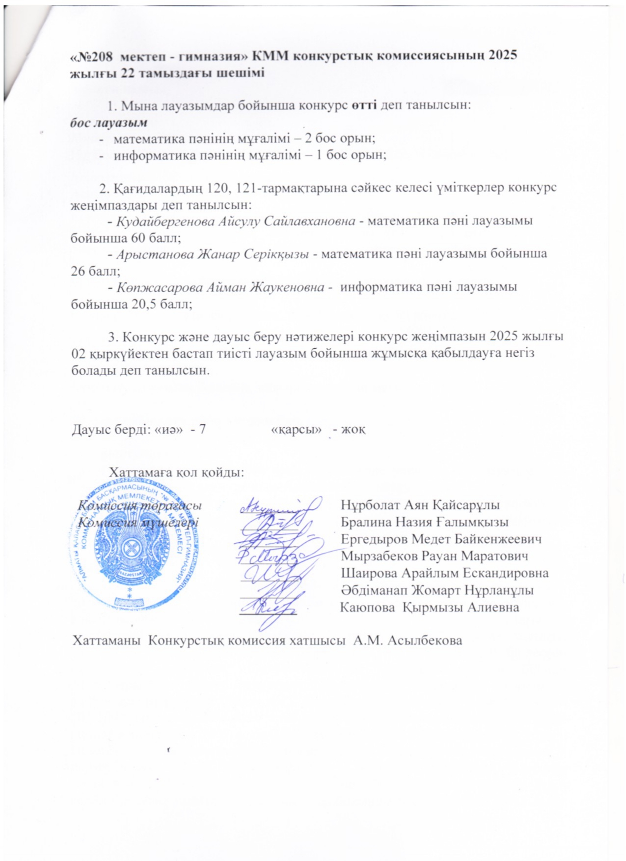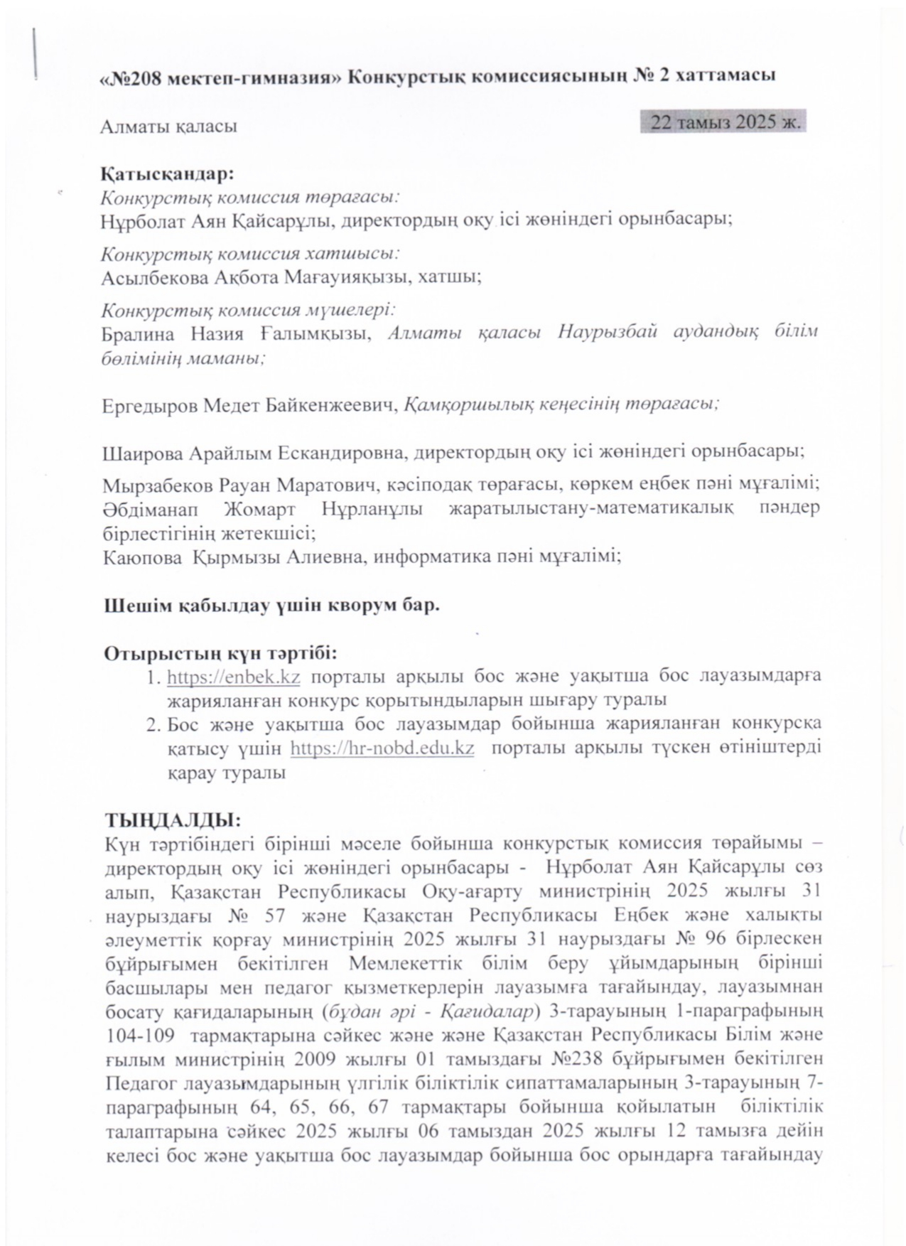 Бүгін (22.08.2025 ж.) мектебімізде педагог қызметкерлерін лауазымға тағайындау туралы конкурстық комиссияның кезекті отырысы өтті.