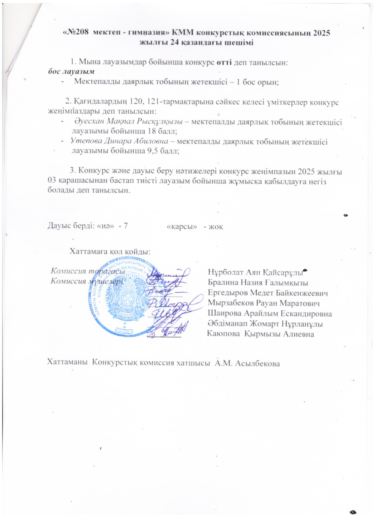 » » №208 мектеп - гимназия Конкурстық комиссиясының №3 хаттамасы