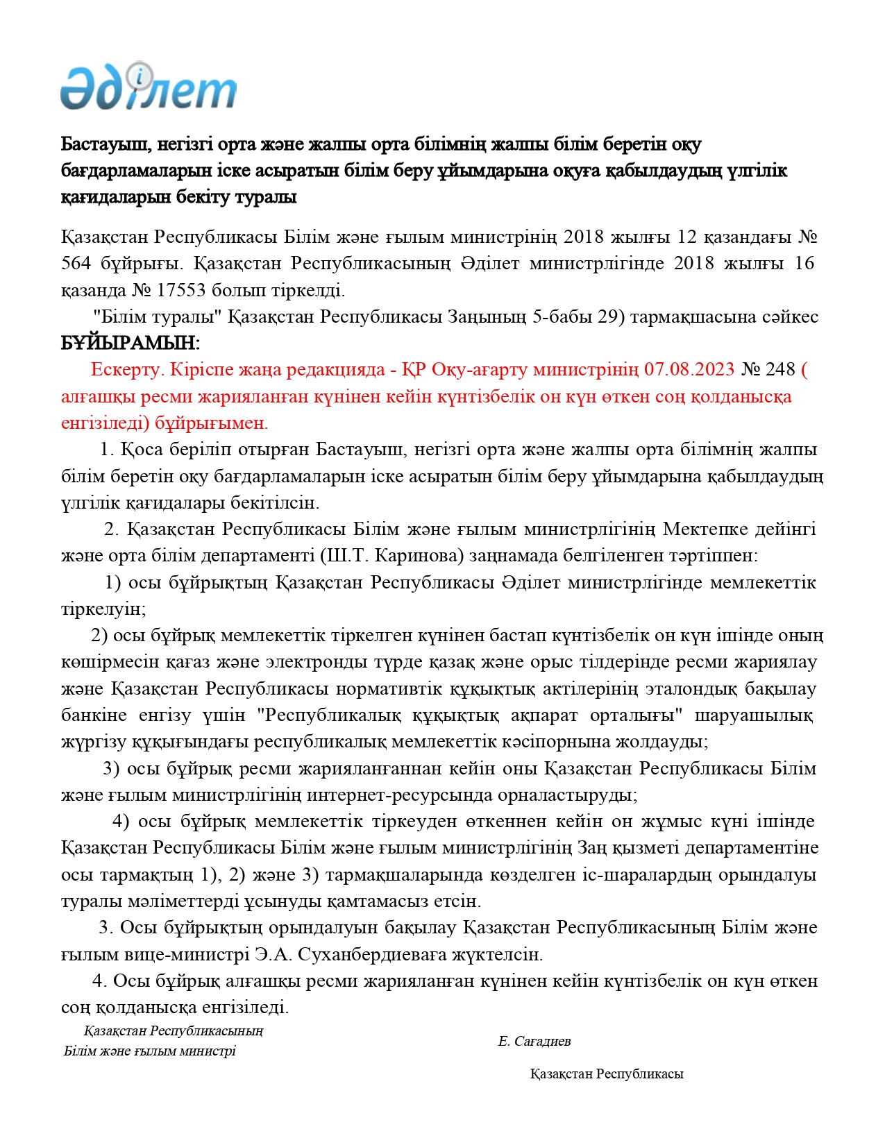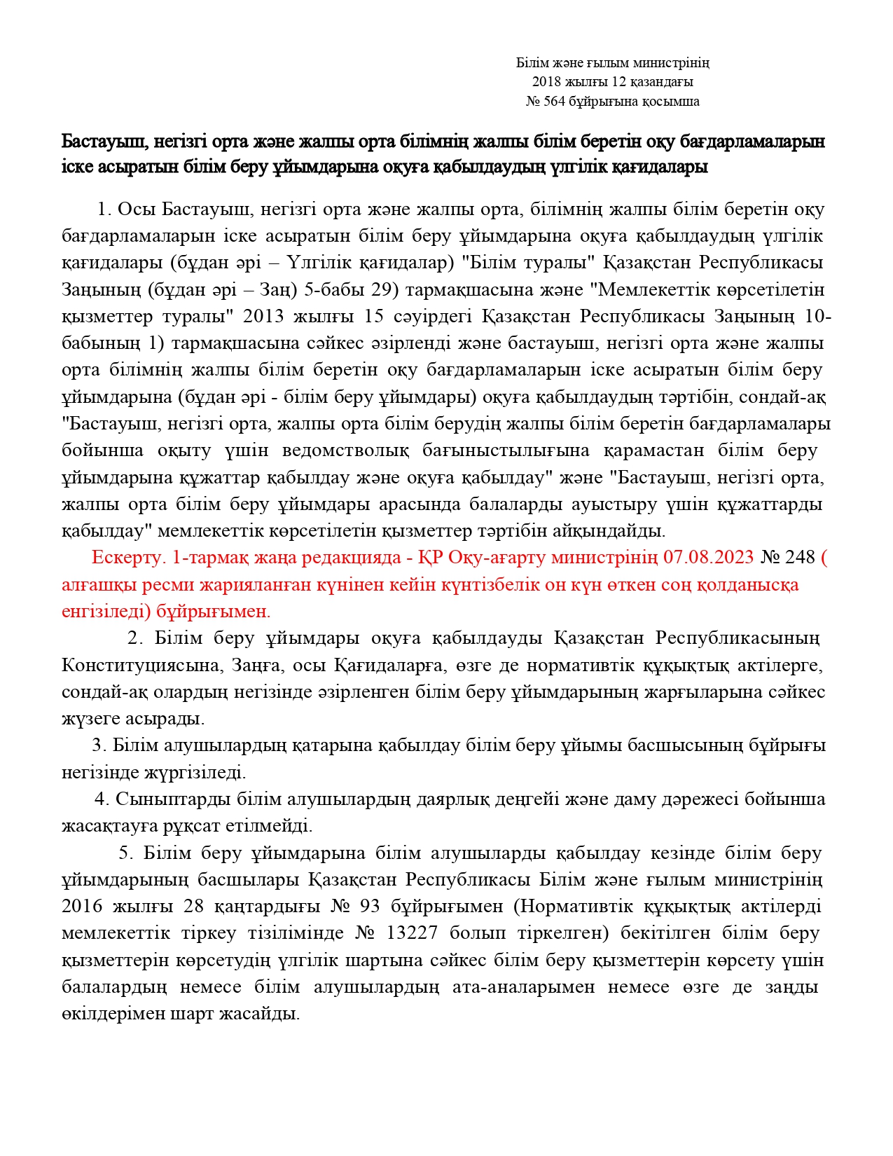 №208 мектеп-гимназия » Ақпарат » Бастауыш, негізгі орта және жалпы орта білімнің жалпы білім беретін оқу бағдарламаларын іске асыратын білім беру ұйымдарына оқуға қабылдаудың үлгілік қағидаларын бекіту туралы