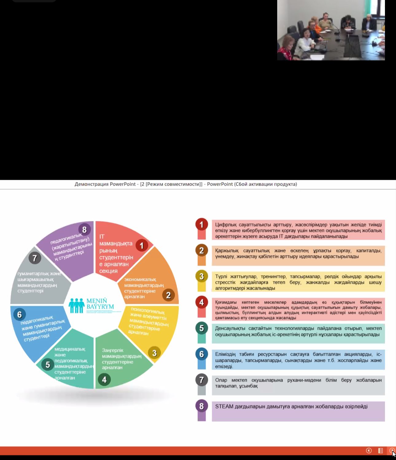 Наурызбай ауданының №157,174,176,186,187,188,192,200,206,207,208 білім беру ұйымдары белсенді қатысты. Колледждер мен ЖОО еріктілерінің жұмысын ұйымдастыру мәселелері талқыланды.