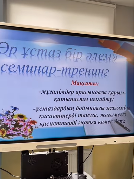 “Мұғалім өзінің білімін үздіксіз көтеріп отырғанда ғана нағыз мұғалім”-деп К.Ушинский айтқандай, бүгінгі таңда , білім беру саласында жаңару процессін тең алып жүрген мұғалімдер арасындағы қарым-қатынасты нығайту, ұстаздардың бойындағы жағымды қасиеттерді тану мақсатында 1-сынып мұғалімдерінің ұйымдастыруымен “Әр ұстаз бір әлем” атты семинар -тренинг жоғары деңгейде өтті.