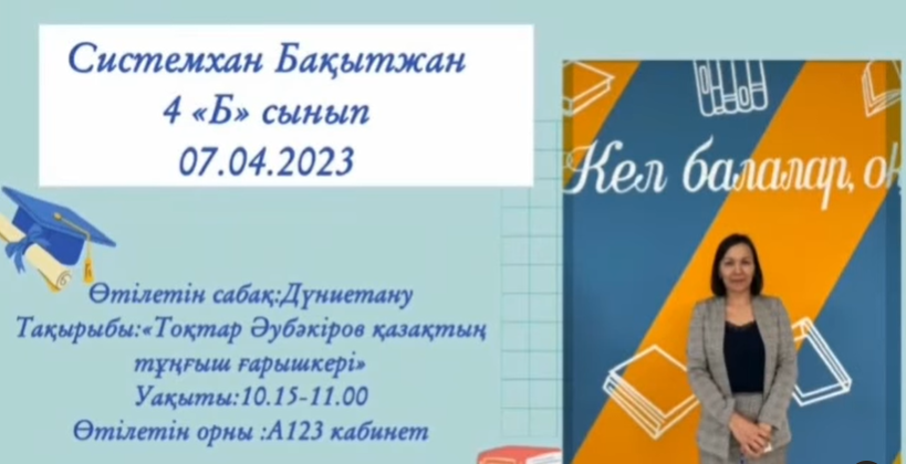 2023 жылдың 7 сәуір күні бастауыш сынып апталығының аясында 4”Б” сыныбының жетекшісі Системхан Бақытжан дүниетану пәнінен “Тоқтар Әубәкіров-қазақтың тұңғыш ғарышкері “ тақырыбында ашық сабақ өткізді.