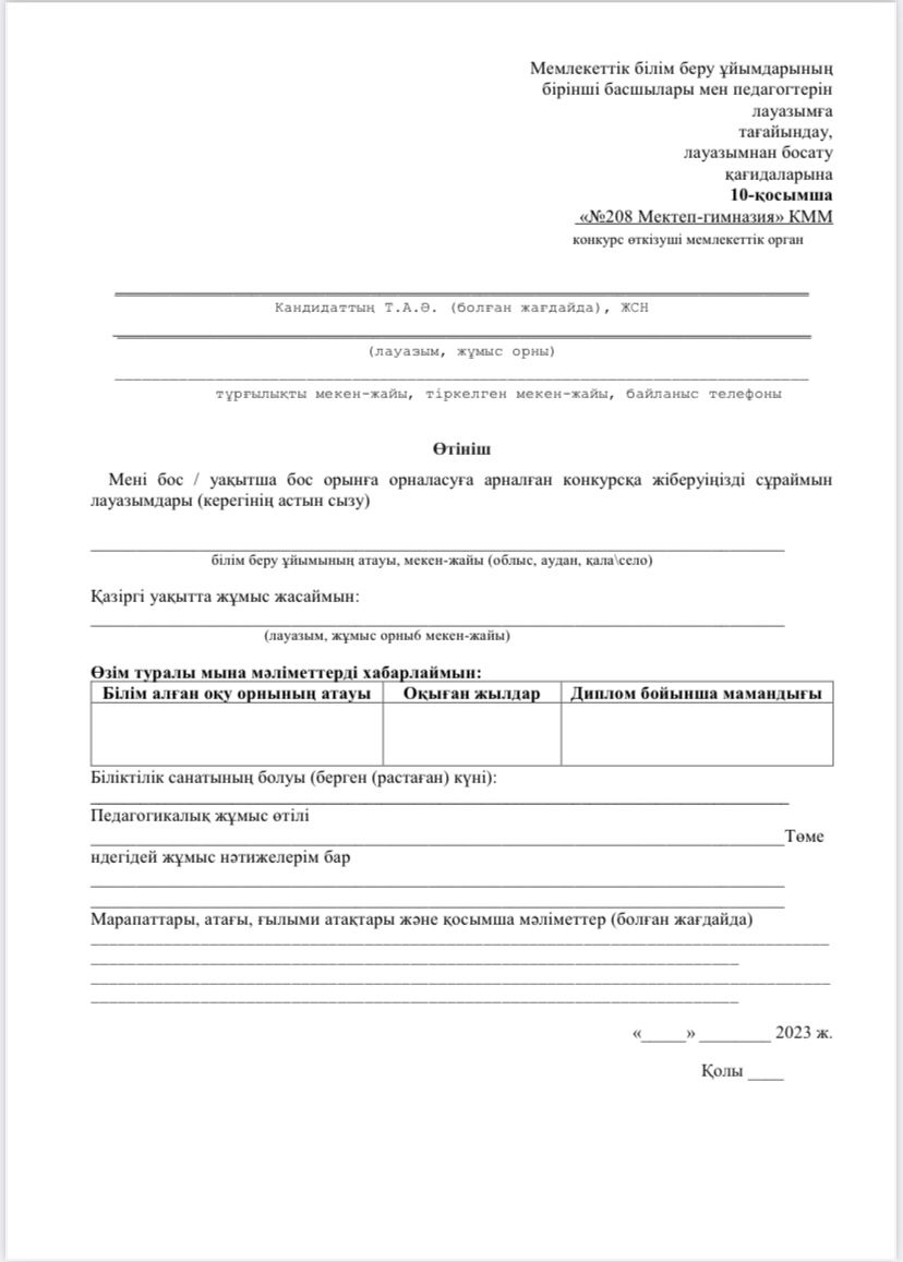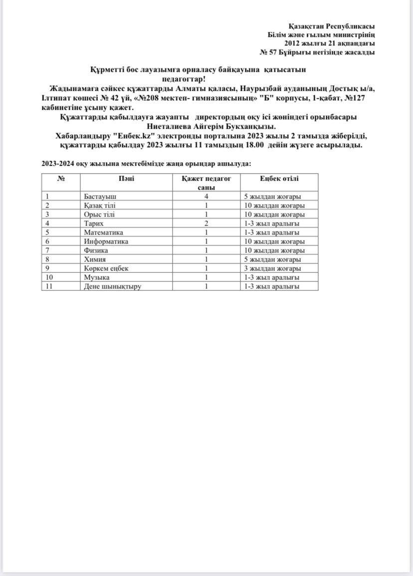 🏫 №208 мектеп – гимназиясы оқытушы лауазымдарына конкурс жариялайды.