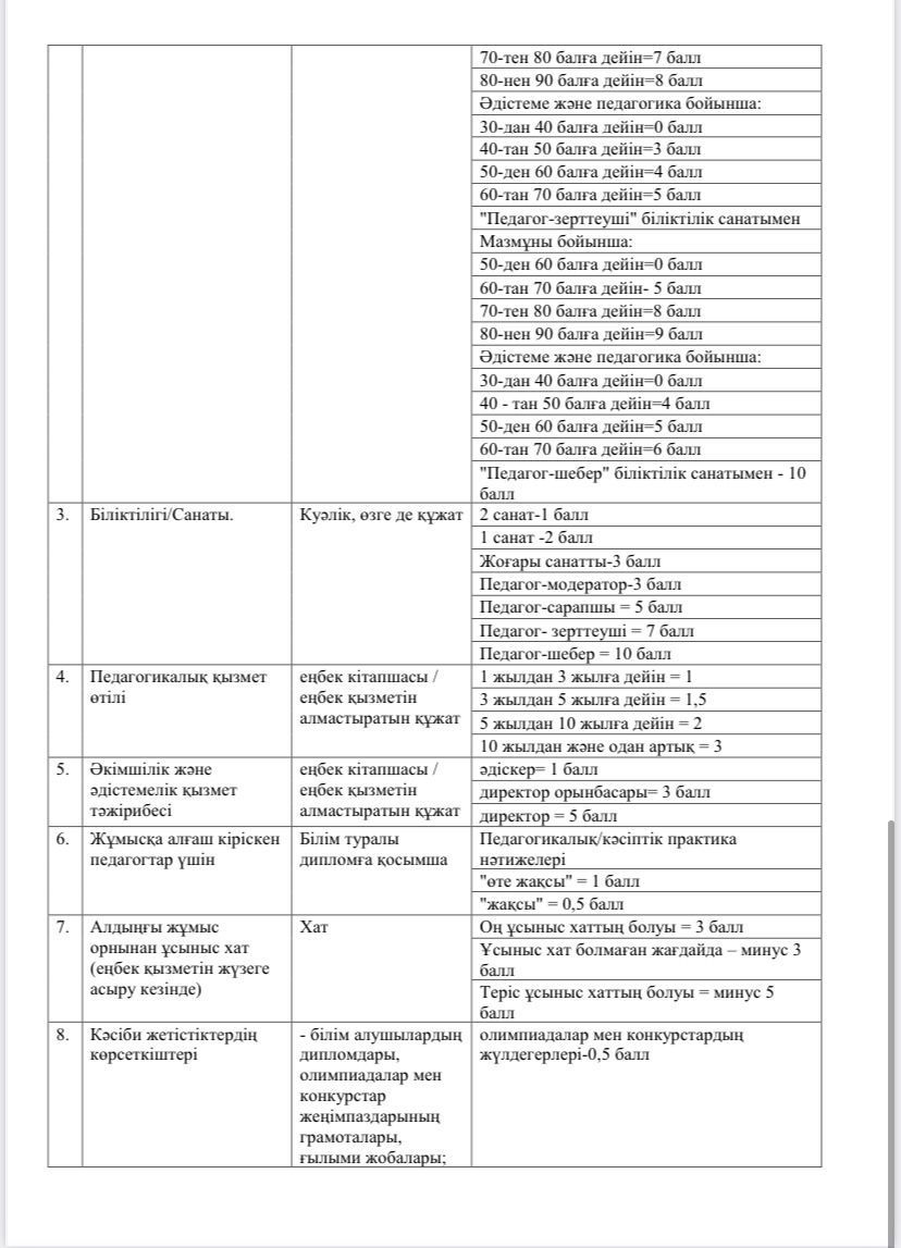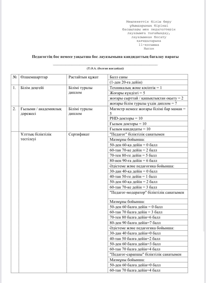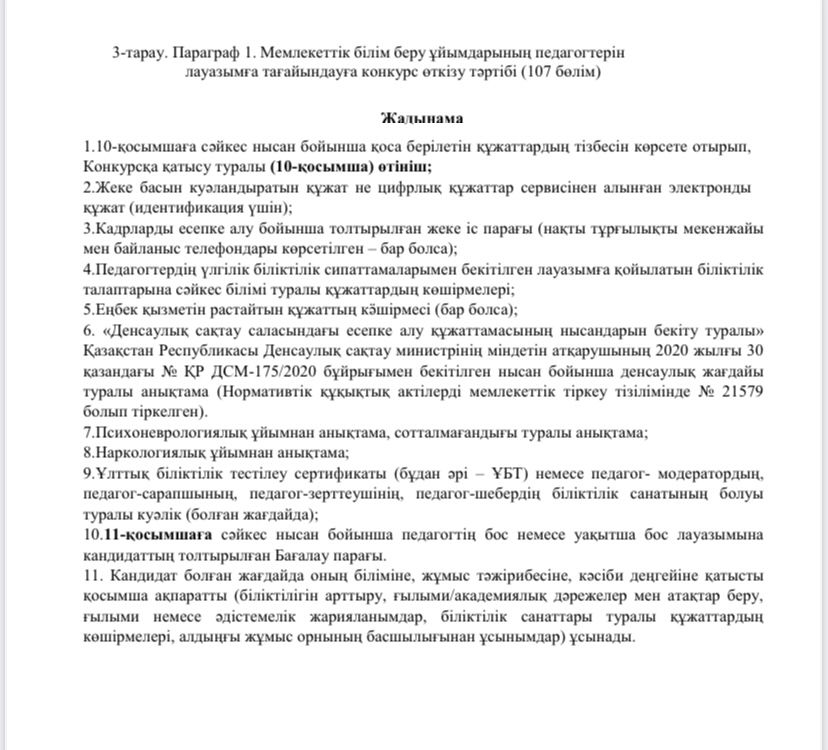 Enbek.kz электронды порталы арқылы жарияланған бос вакантты орындарды қарастыра аласыздар. Ол үшін Білім және ғылым министрінің 2012 жылғы 21 ақпандағы №57 Бұйрығы негізінде төмендегі жадынамаға сәйкес құжаттарыңызды қағаз немесе электронды түрінде ұсынуларыңыз қажет.