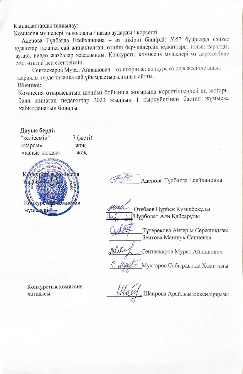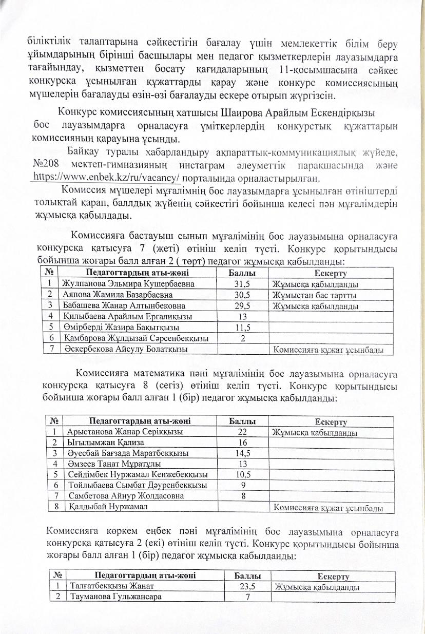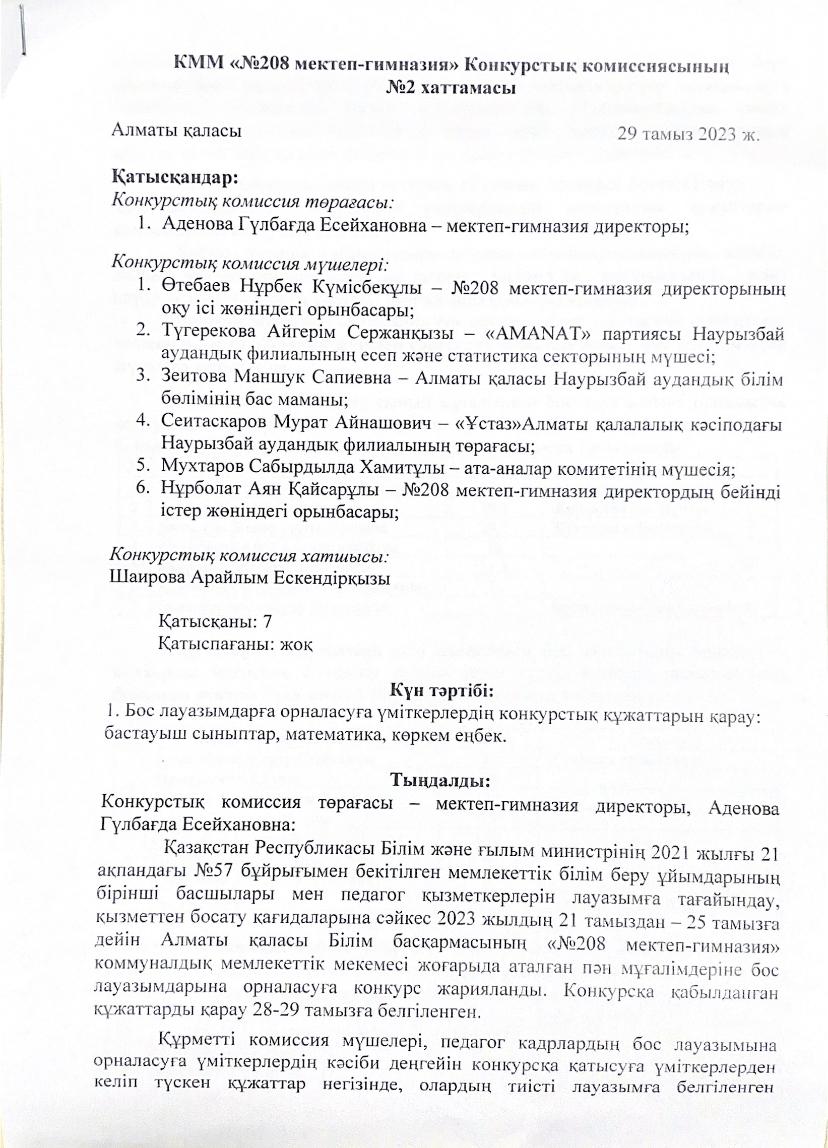 КММ №208 мектеп – гимназия Конкурстық комиссиясының №2 хаттамасы. » №208 мектеп-гимназия