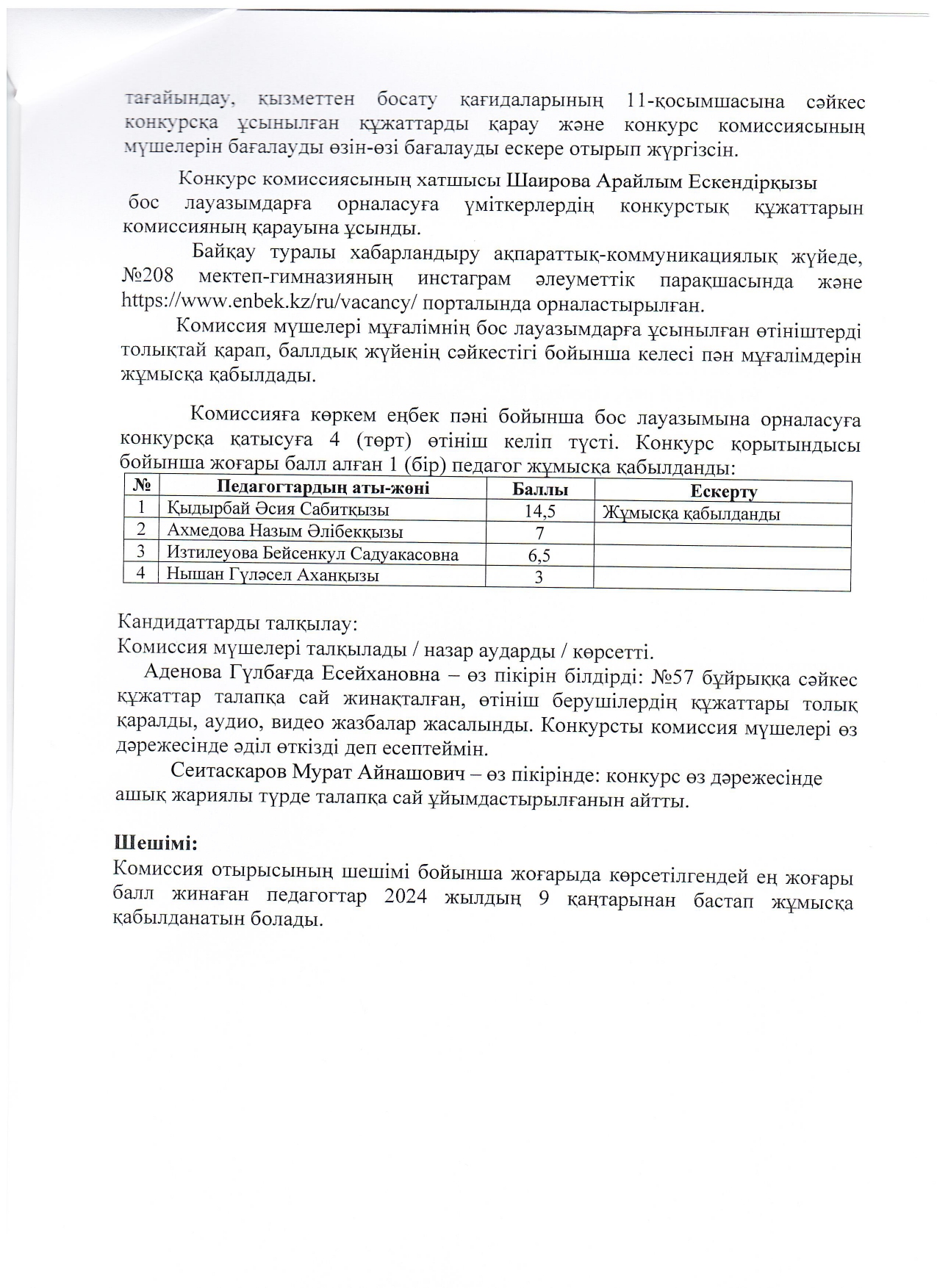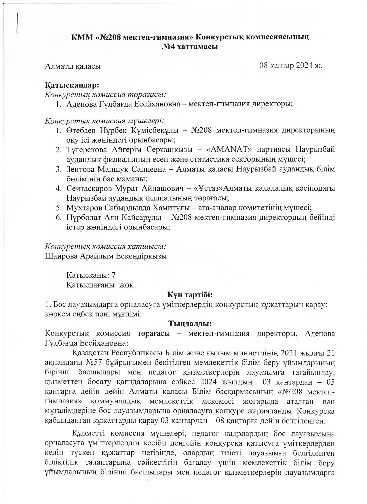 КММ №208 мектеп – гимназия Конкурстық комиссиясының №4 хаттамасы. » №208 мектеп-гимназия