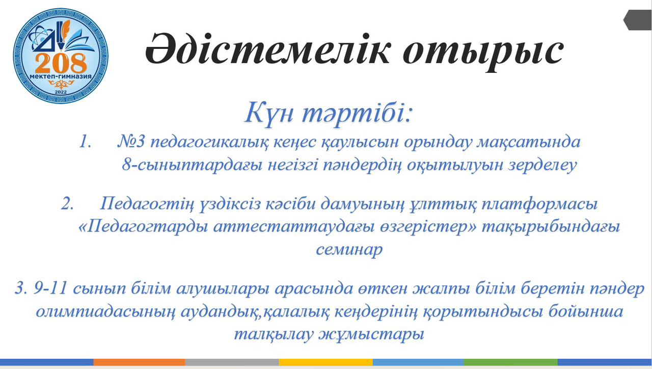 Ағымдағы жылдың 16 қаңтар күні Алматы қаласы, Наурызбай ауданына қарасты, №208 мектеп- гимназиясында директордың бейінді істер жөніндегі орынбасары Нұрболат Аян Қайсарұлы Білім және ғылым министрінің 2016 жылғы 27 қаңтардағы №83 бұйрығы «Педагогтерді аттестаттаудан өткізу қағидалары мен шарттары» бойынша 2024 жылы мұғалімдерді аттестаттау рәсімінде қандай өзгерістер бар екендігіне түсіндірме жұмыстарын жүргізіп таныстырды.