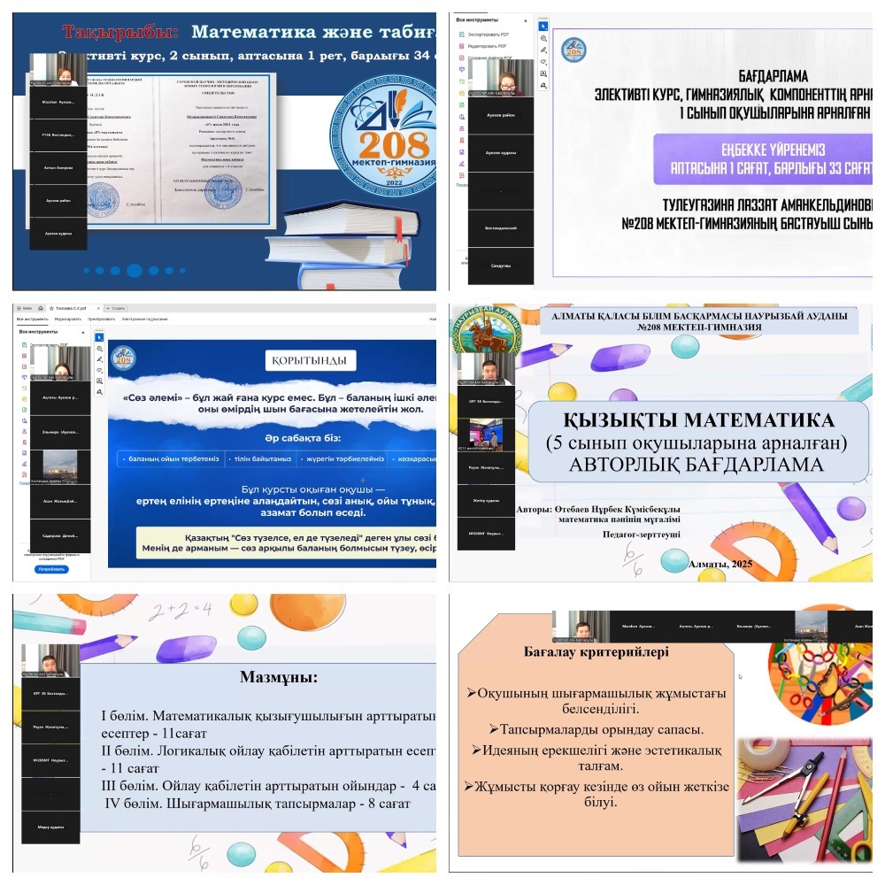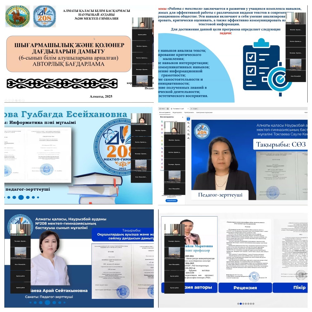 2025 жылдың 17 сәуір күні №208 мектеп-гимназия базасында "Білім мен технология: пәндік шеберліктің жаңа келбеті" тақырыбында педагогтерді аттестаттаудан өткізу тәртіптері мен талаптарына сәйкес, тәжірибе жинақтау және тарату мақсатында қалалық вебинар ұйымдастырылды. Вебинар ZOOM платформасы арқылы онлайн форматта өткізілді.