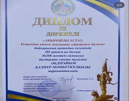 «АБЫРОЙЛЫ ҰСТАЗ: Ұстаздық еткен жалықпас үйретуден балаға» байқауының аудандық кезеңінде III орынға ие болған № 208 мектеп - гимназиясының бастауыш сынып мұғалімі Әбдірайым Балнұр Мамбетқұлқызы марапатталды. Құттықтаймыз💐