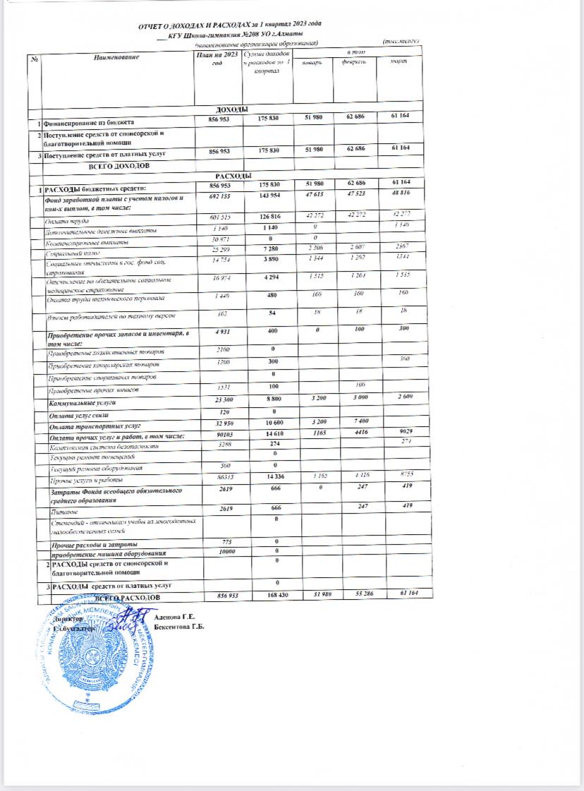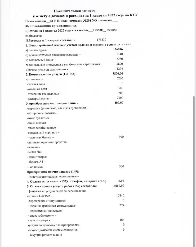 Отчет о доходах и расходах за 1 квартал 2023 года » №208 мектеп-гимназия