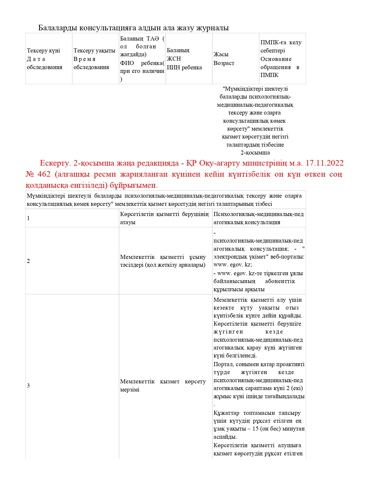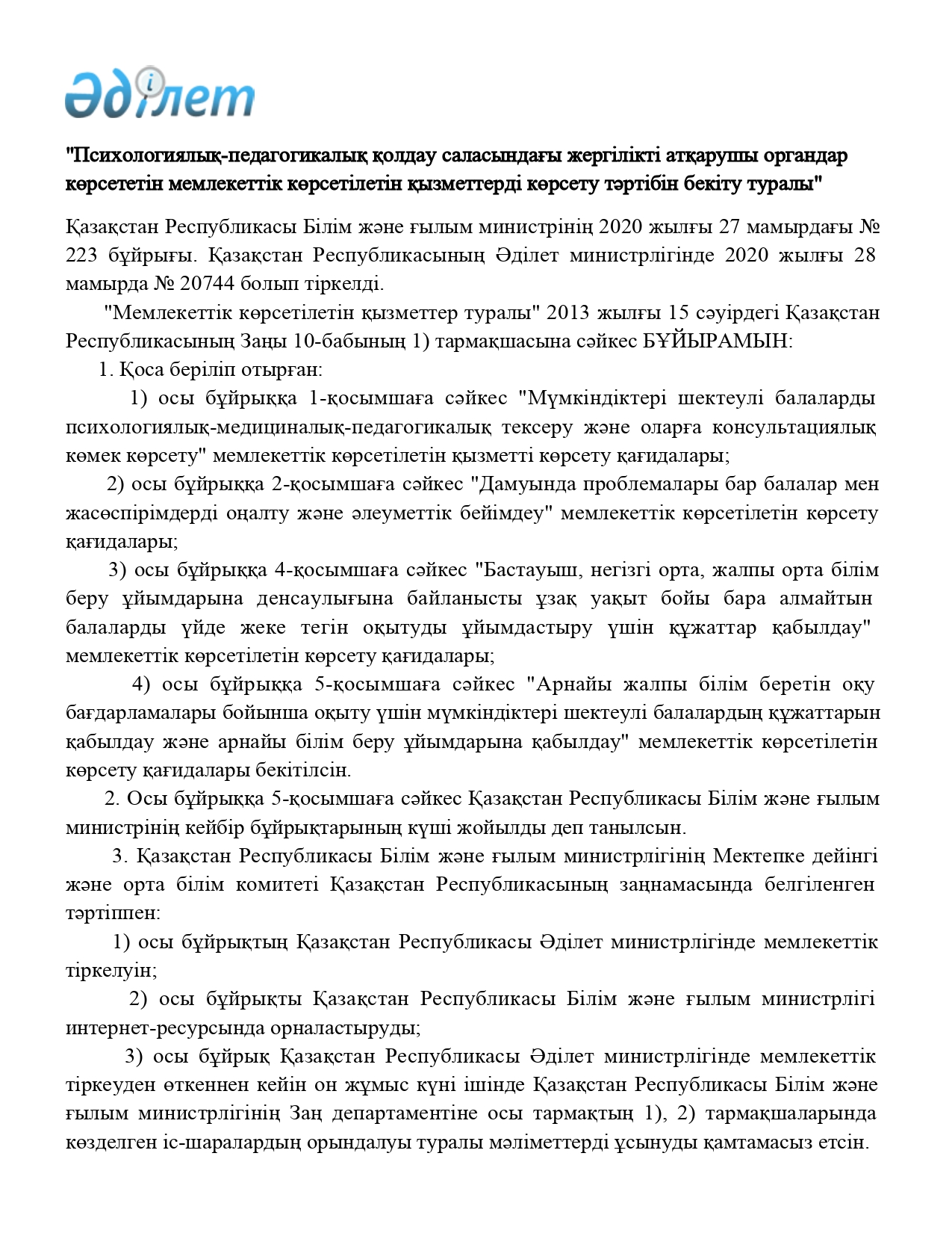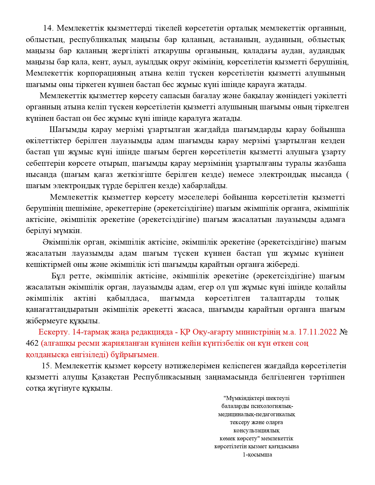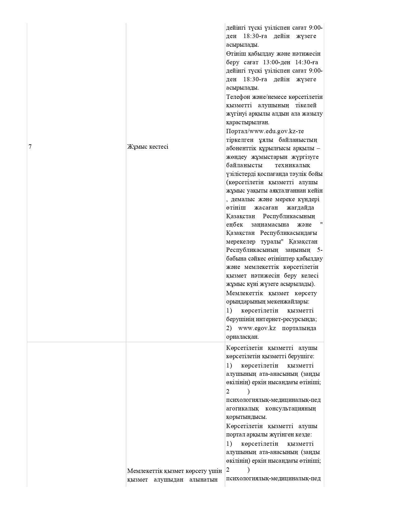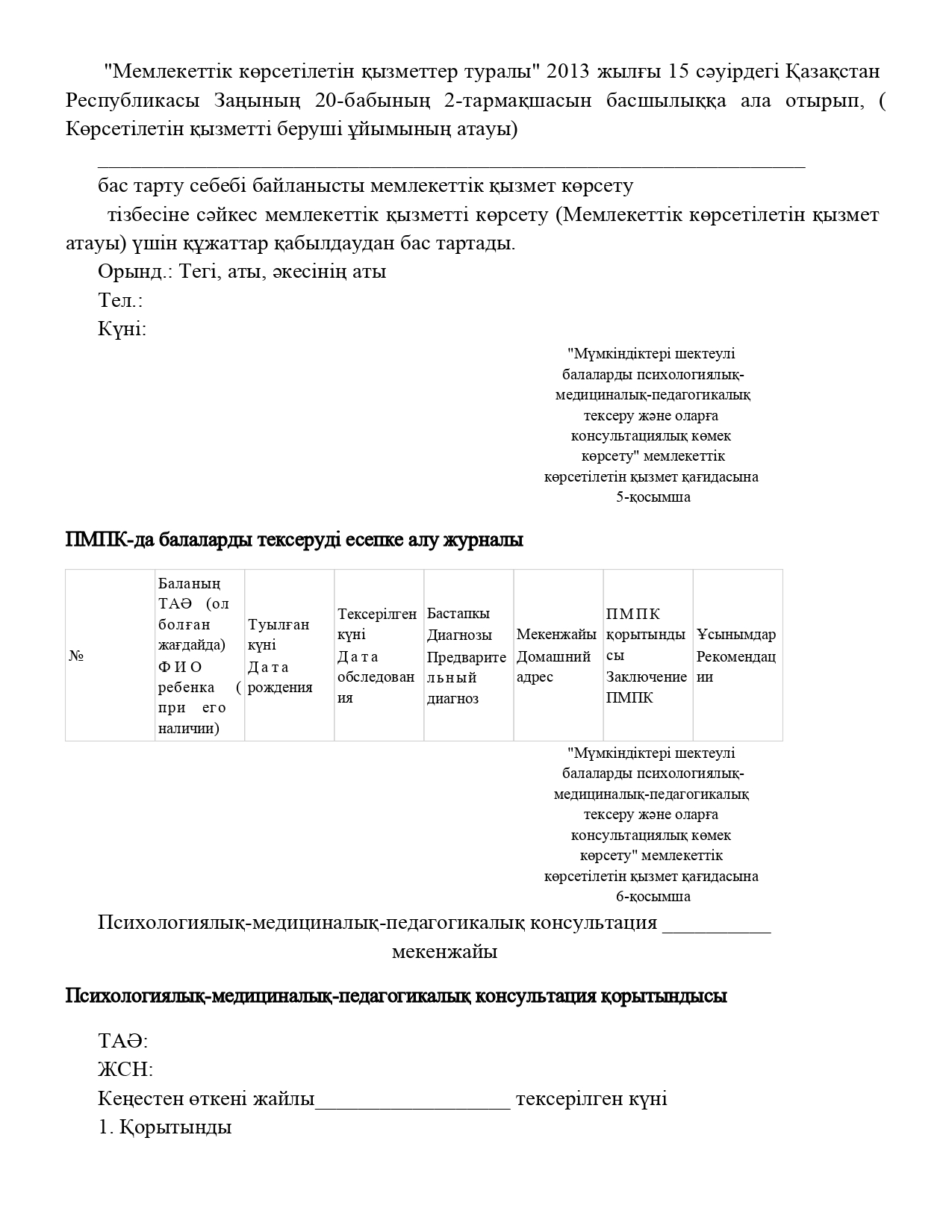№208 мектеп-гимназия » Ашық орган » Мемлекеттік қызметтер » "Психологиялық-педагогикалық қолдау саласындағы жергілікті атқарушы органдар көрсететін мемлекеттік көрсетілетін қызметтерді көрсету тәртібін бекіту туралы"
