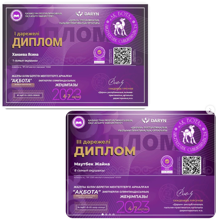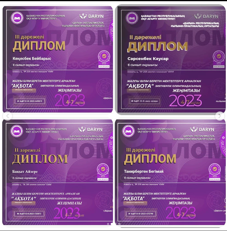 «Дарын» РҒПО 2023 жылғы 4-7 ақпан аралығында дарынды оқушыларды анықтап, олардың математикалық сауаттылығын арттыру мен ғылым негіздері бойынша білімдерін тереңдету мақсатында өткізілген «Ақбота» зияткерлік олимпиадасына №208 мектеп гимназиясының 1-10 - сынып оқушылары қатысты.