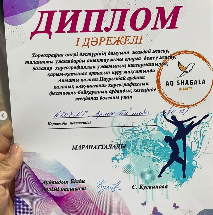 Хореография өнері дәстүрінің дамуына жағдай жасау, талантты ұжымдарды анықтау және оларға демеу жасау, балалар хореографиялық ұжымының шығармашылық қарым-қатынас ортасын құру мақсатында Алматы қаласы Наурызбай ауданы қалалық «Ақ-шағала» хореографиялық фестиваль-байқауының аудандық кезеңінде жүлделі🥇- орынмен №208 мектеп - гимназияның “Арман” би тобы марапатталды.