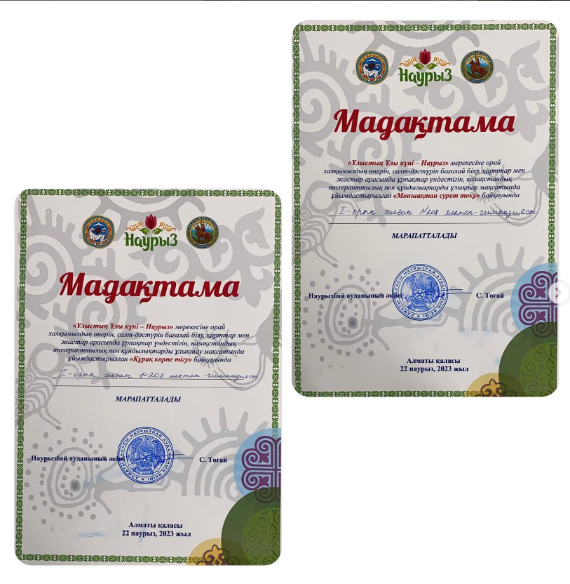 Наурызбай ауданының әкімдігі «Ұлыстың Ұлы күні- Наурыз » мерексіне орай халқымыздың өнерін, салт-дәстүрін бағалай білу,қарттар мен жастар арасында ұрпақтар үндестігін, қазақстандық толеранттылық пен құндылықтарды ұлықтау мақсатында ұйымдастырылыған «Құрақ көрпе тігу» мен «Моншақтан сурет тоқу»байқауларына қатысып, мектебіміз жүлделі I - орынды иеленді💐💐💐