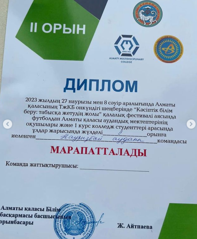 2023 жылдың 27 наурыз мен 8 сәуір аралығында Алматы қаласының ТжКБ онкүндігі шеңберінде “Кәсіптік білім беру: табысқа жетудің жолы” қалалық фестивалі аясында футболдан Алматы қаласы аудандық мектептерінің оқушылары және 1 курс колледж студенттері арасында жарыс өз мәресіне жетті.