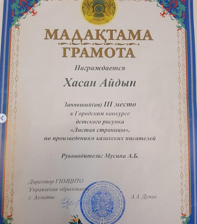 Қазақ жазушыларының шығармашылығы бойынша "Листая страницы" атты қалалық балалар сурет байқауында жүлделі 3- орынмен Хасан Айдын марапатталды.