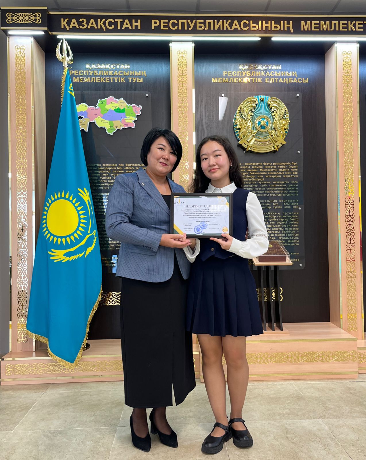 «Алматы қаласы, Білім басқармасының «Алматы дарыны» дарынды балалар мен талантты жастарды анықтау және қолдау жөніндегі орталығы мен "Qalam school" мектебі бірлесе ұйымдастыруымен өткен Алматы қаласындағы мектепаралық "ALTYN QALAM" математика-лингвистикалық оқушылар олимпиадасында жоғары нәтиже көрсетіп, жүлделі ІІІ орынмен мектебіміздің 11 "Ә" сынып білім алушысы Баймахан Айша марапатталды.