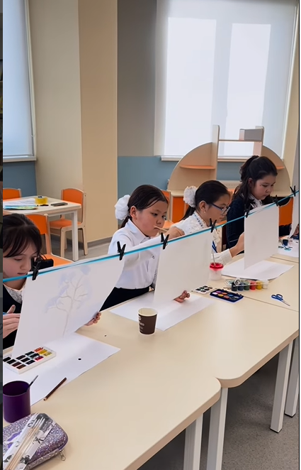 Бүгін № 208 мектеп-гимназиясының 4 сынып оқушылары арасында бастауыш сынып мұғалімдері: Елекбаева С.Е мен Әділбай А.Қ басшылығымен, бейнелеу өнерінің қыр-сырын жан-жақты үйрету мақсатында “Мен болашақ суретшімін” сайысы өтті. Бұл сайыстың ерекшелігі балалар суретті жіпке ілінген қағазға қылқаламмен салды.
