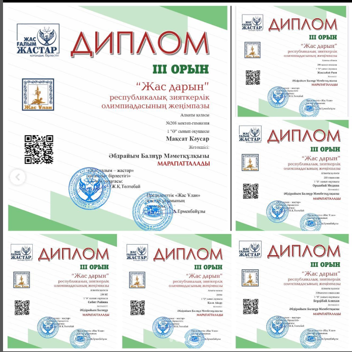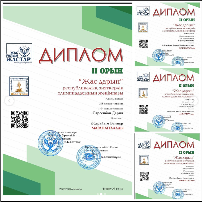 Алматы қаласы, Наурызбай ауданы, № 208 мектеп-гимназияның 1”Ә” сынып оқушылары “Жас дарын” республикалық зияткерлік олимпиадасына қатысып, жүлделі орындарды иеленді.Сынып жетекшісі: Әбдірайым Балнұр