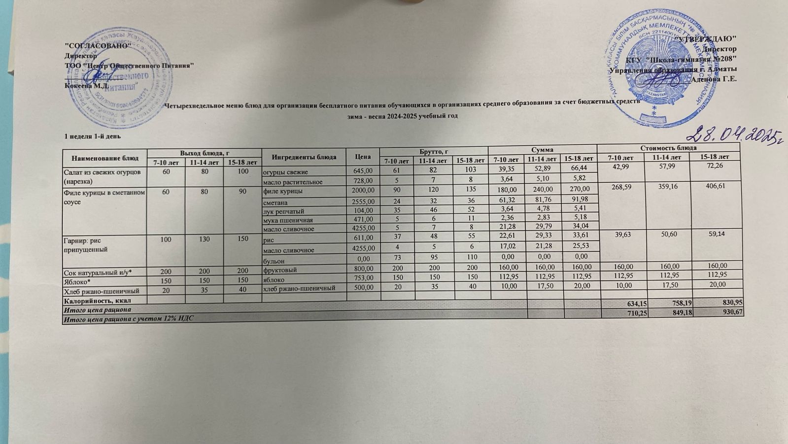 28.04.2025 Асхана мәзірі » №208 мектеп-гимназия