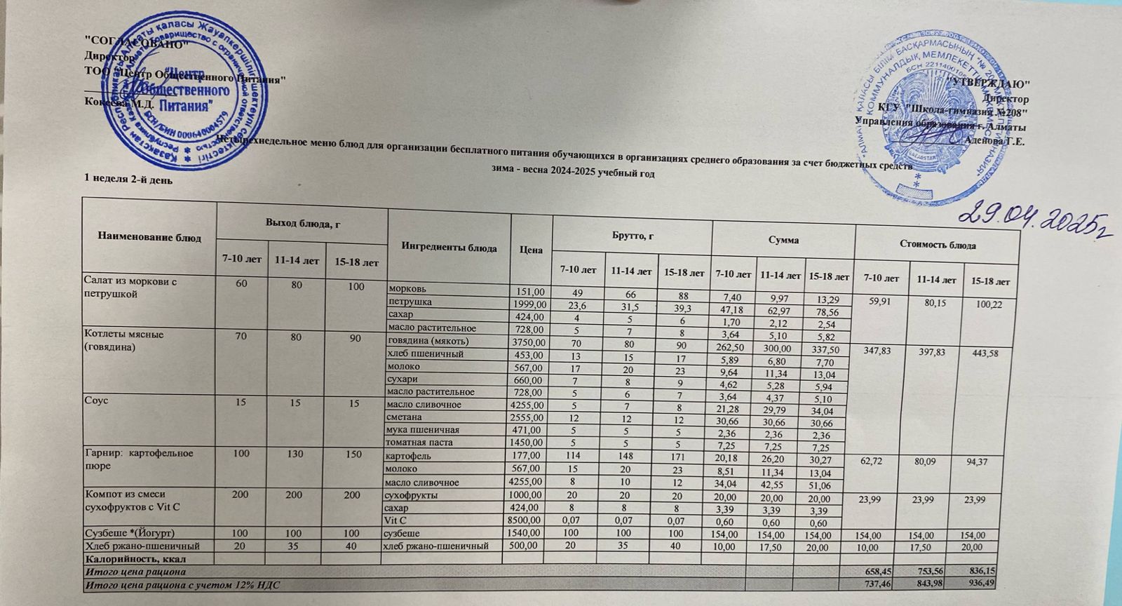 29.04.2025 Асхана мәзірі » №208 мектеп-гимназия