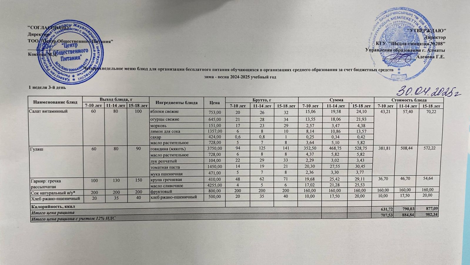 30.04.2025 Асхана мәзірі » №208 мектеп-гимназия