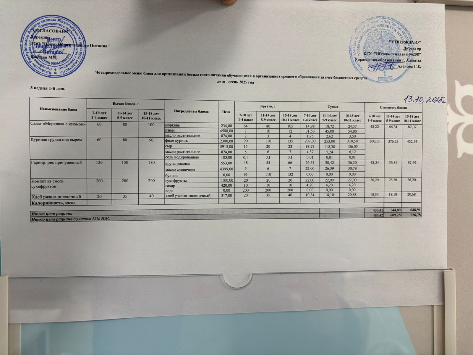 13.10.2025 Асхана мәзірі » №208 мектеп-гимназия