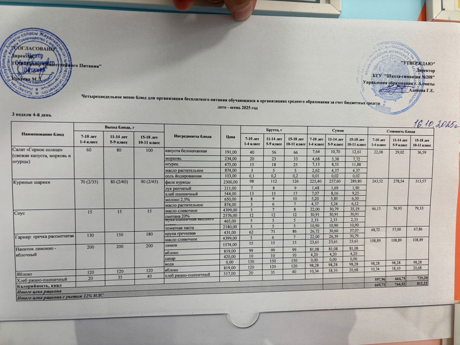 16.10.2025 Асхана мәзірі » №208 мектеп-гимназия