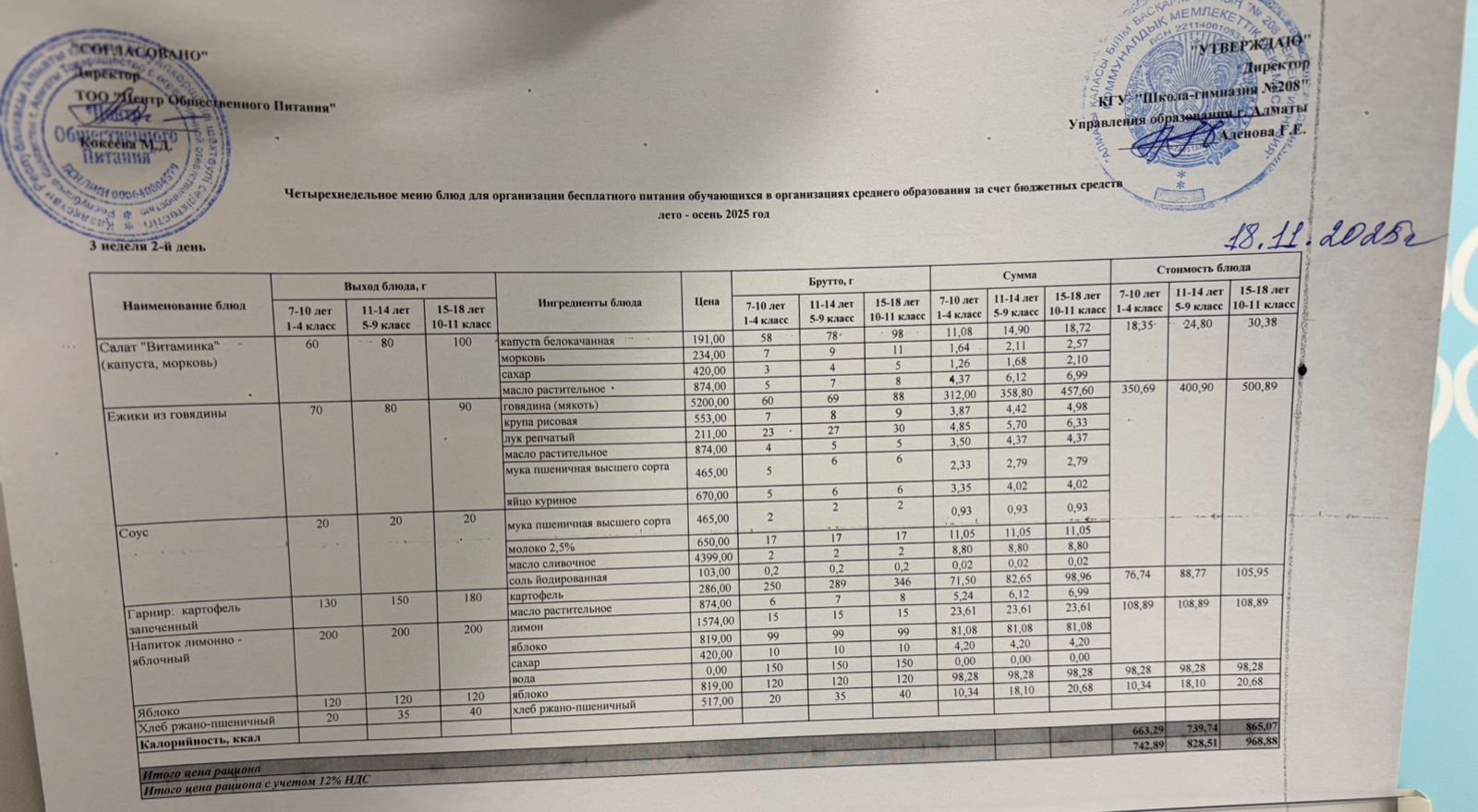 18.11.2025 Асхана мәзірі » №208 мектеп-гимназия