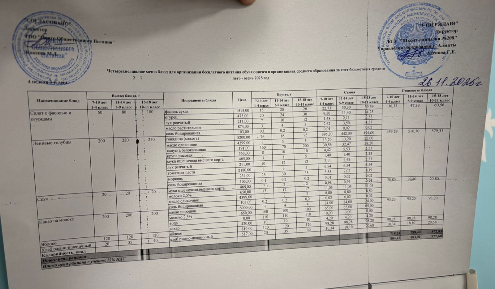 26.11.2025 Асхана мәзірі » №208 мектеп-гимназия