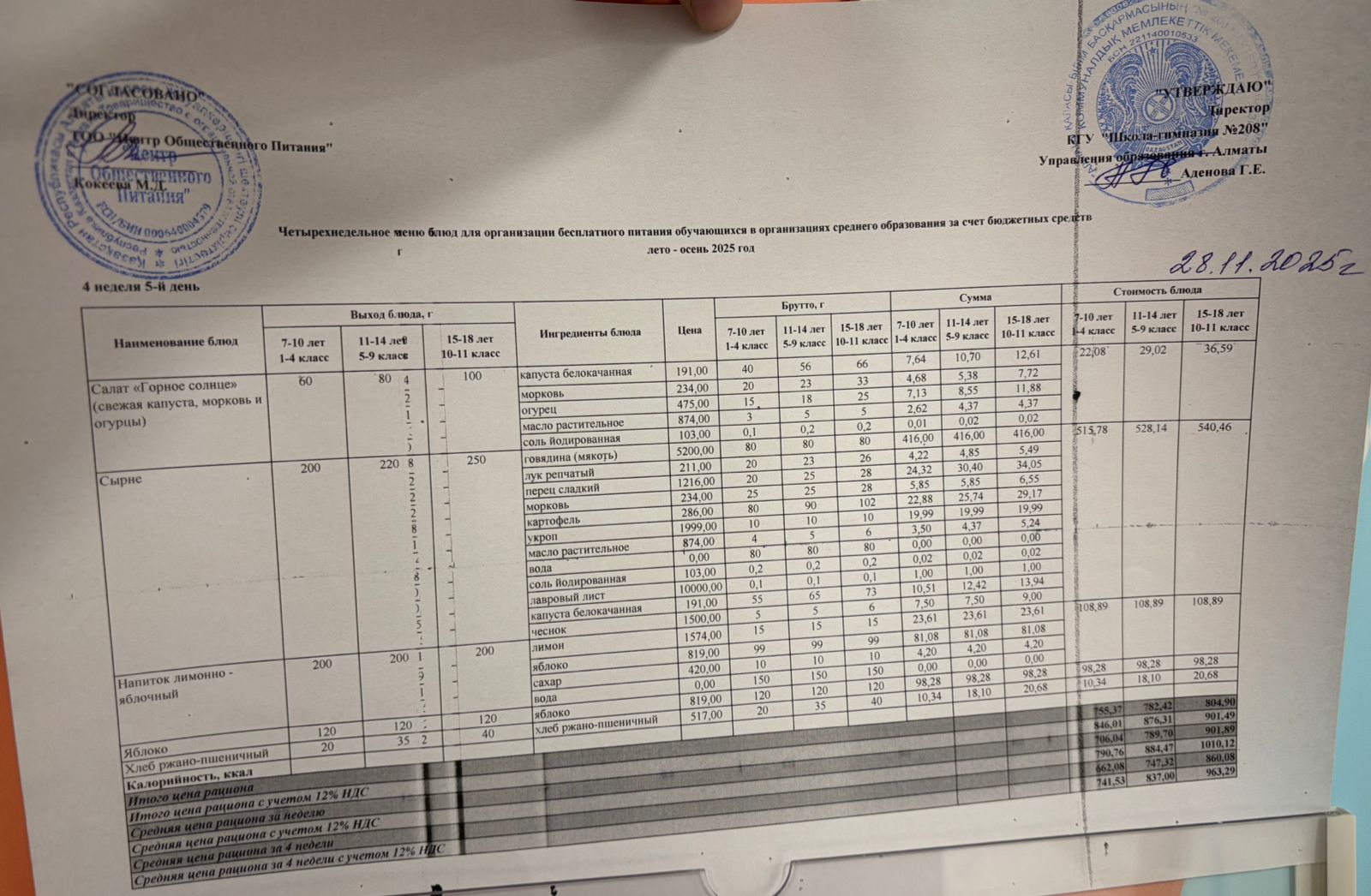28.11.2025 Асхана мәзірі » №208 мектеп-гимназия