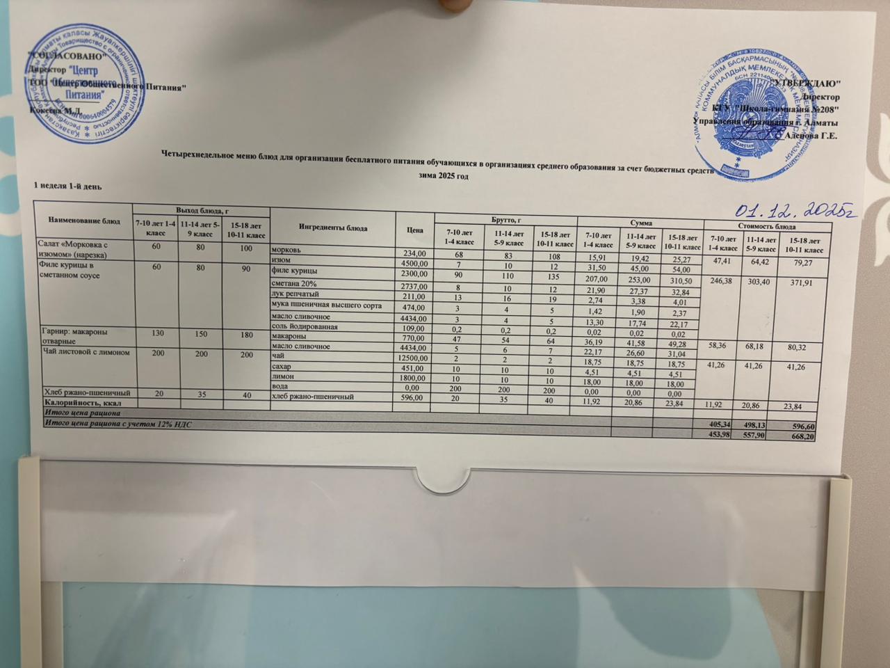 01.12.2025 Асхана мәзірі » №208 мектеп-гимназия