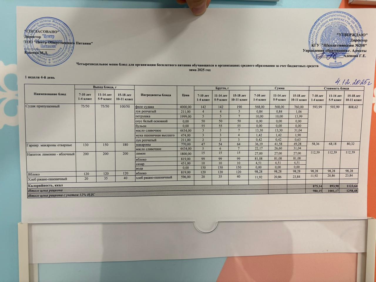 04.12.2025 Асхана мәзірі » №208 мектеп-гимназия
