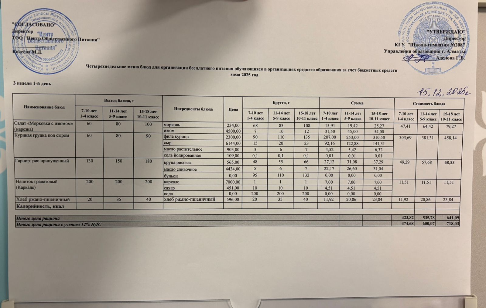 15.12.2025 Асхана мәзірі » №208 мектеп-гимназия