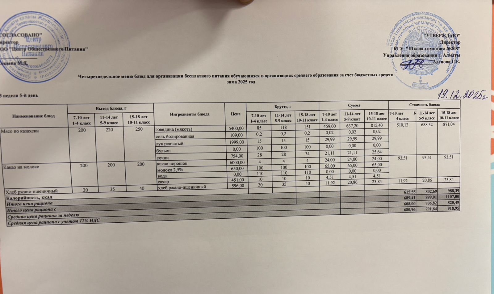 19.12.2025 Асхана мәзірі » №208 мектеп-гимназия