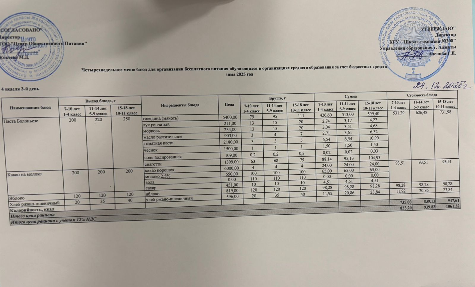 24.12.2025 Асхана мәзірі » №208 мектеп-гимназия