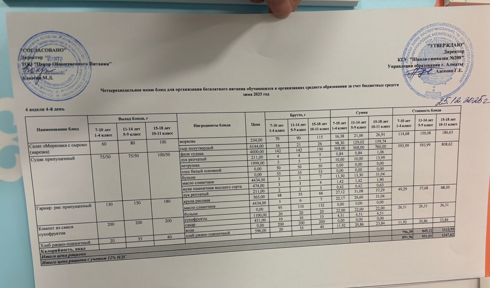 25.12.2025 Асхана мәзірі » №208 мектеп-гимназия