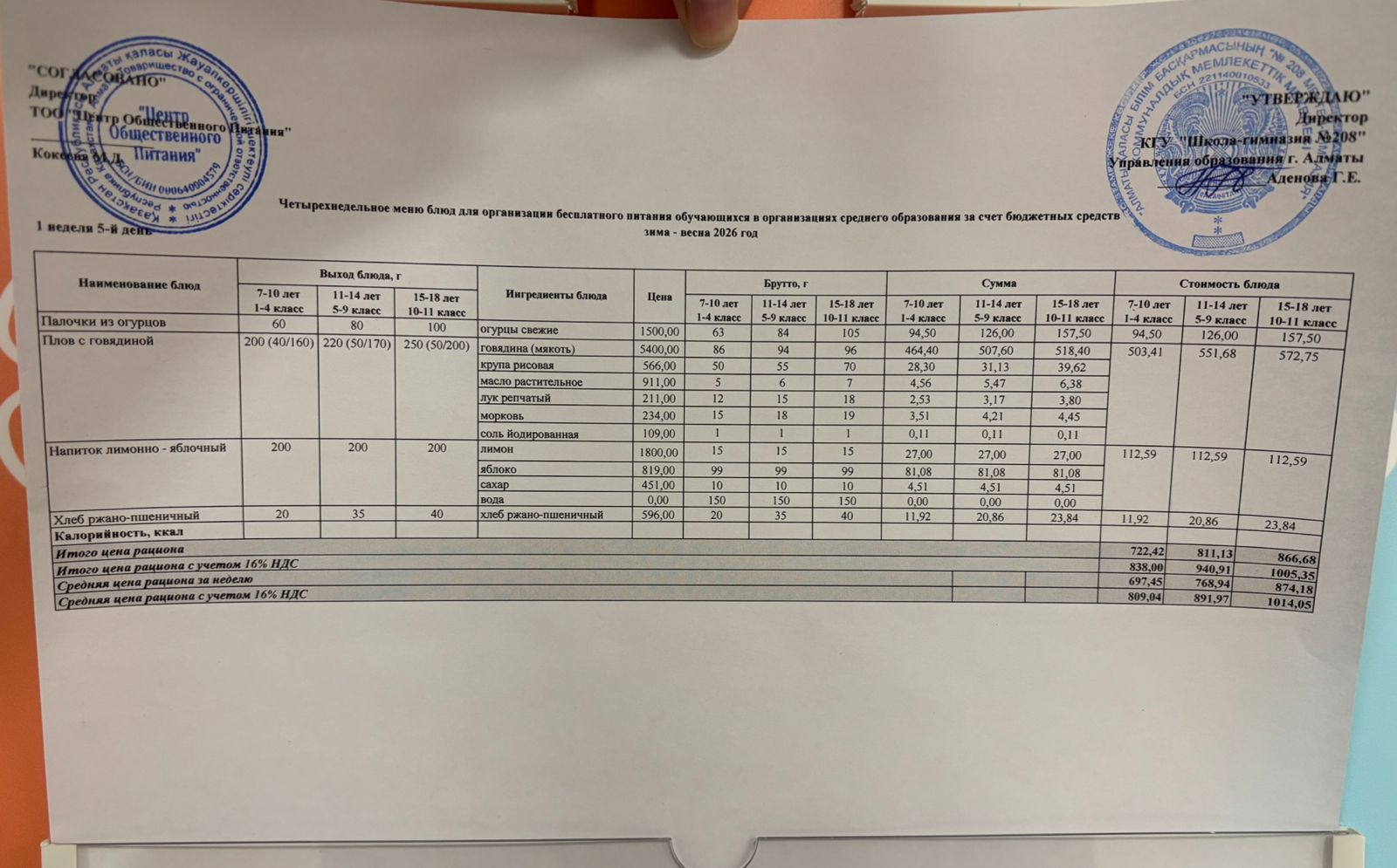 09.01.2026 Асхана мәзірі » №208 мектеп-гимназия