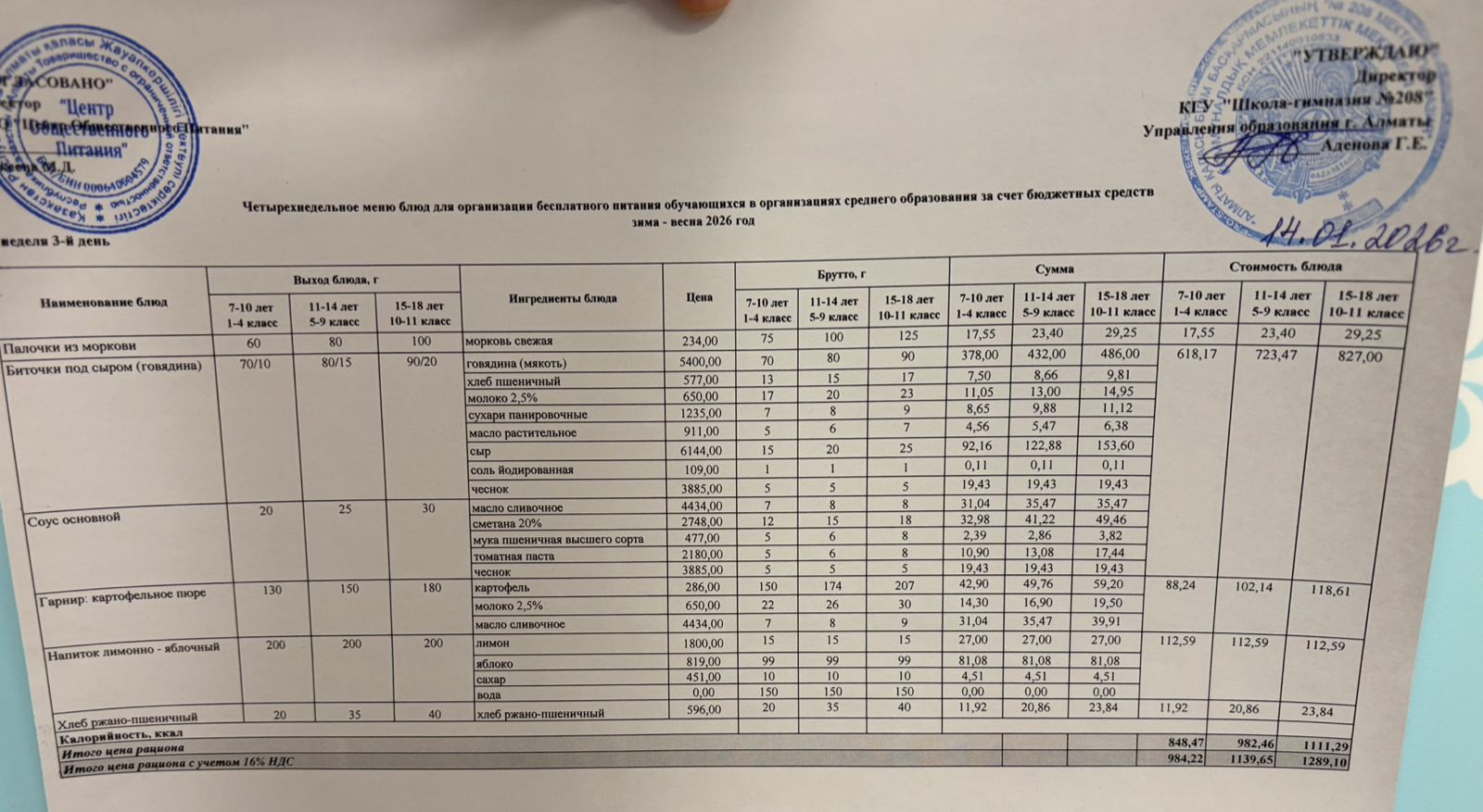 14.01.2026 Асхана мәзірі » №208 мектеп-гимназия
