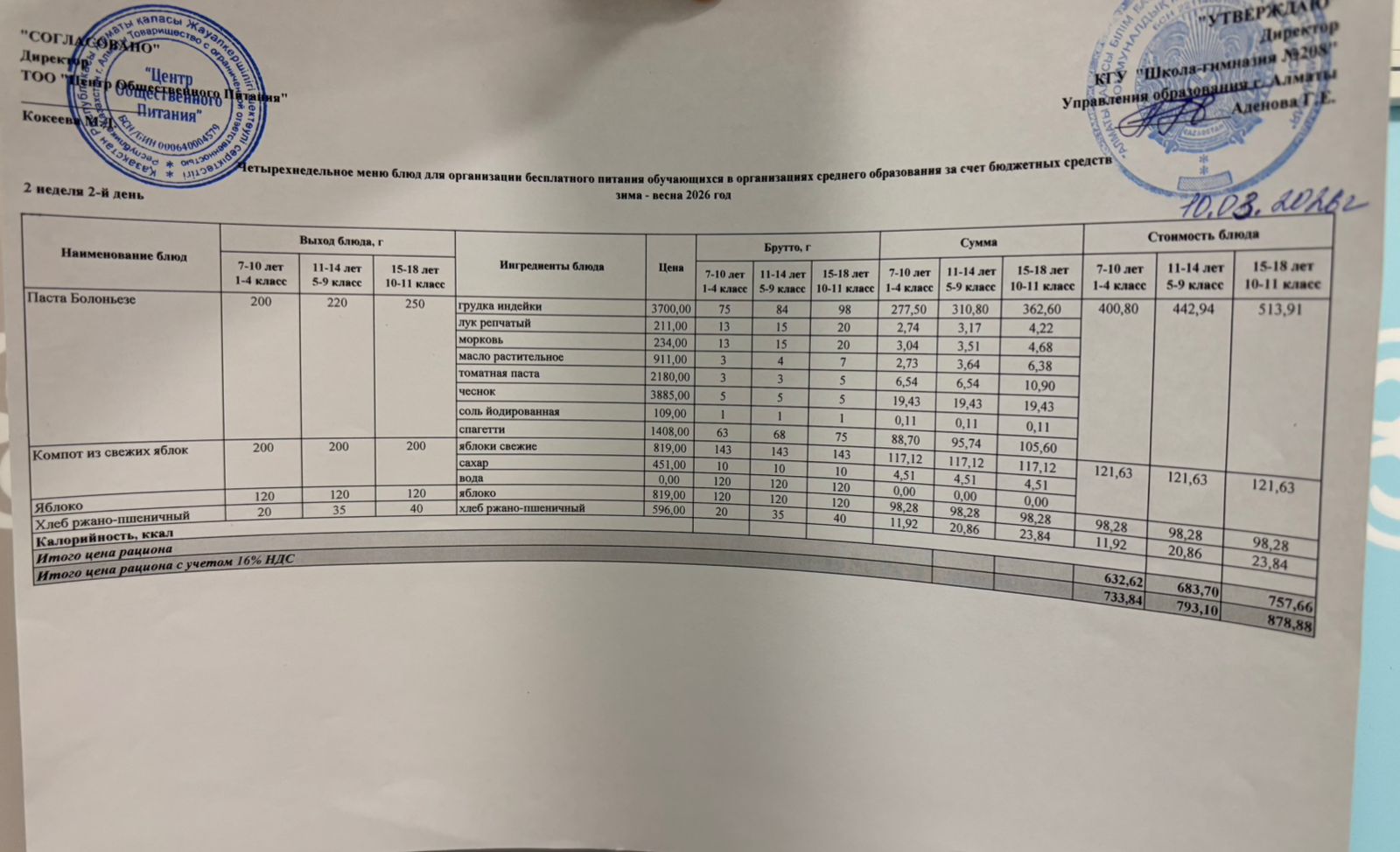 10.03.2026 Асхана мәзірі » №208 мектеп-гимназия