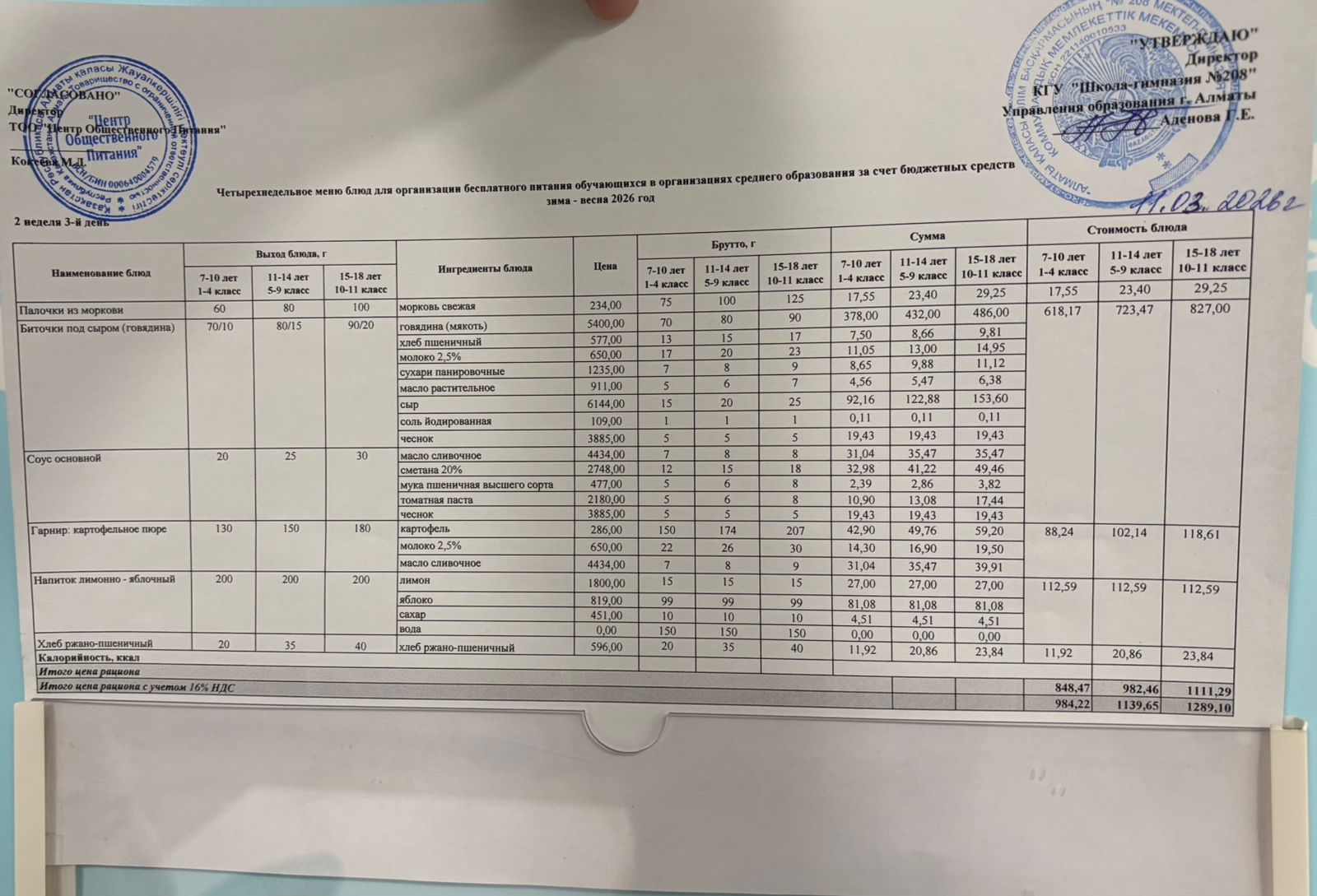 11.03.2026 Асхана мәзірі » №208 мектеп-гимназия