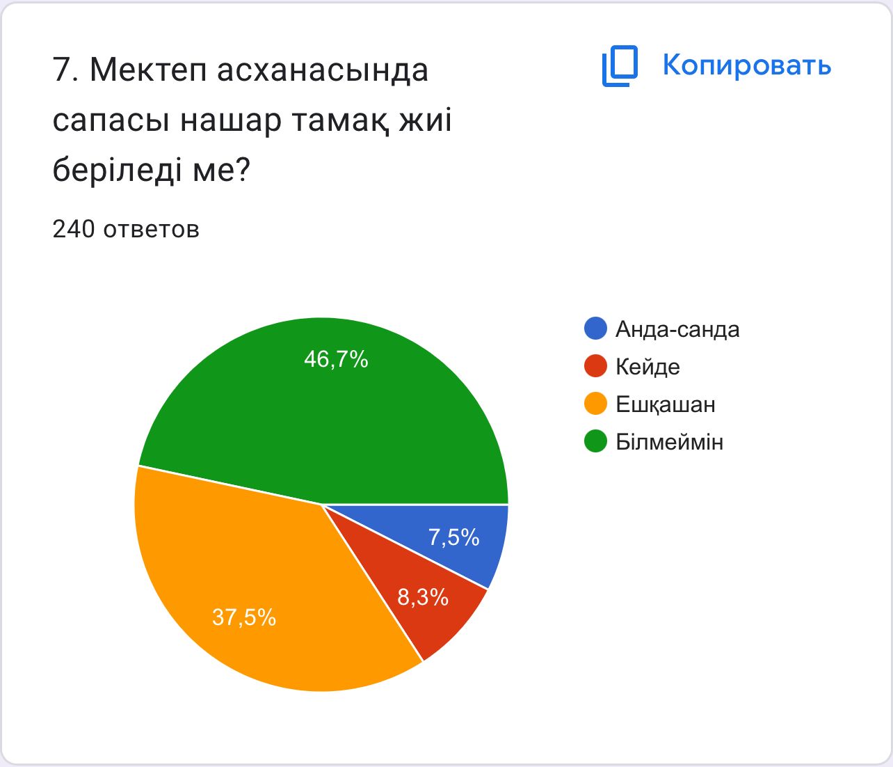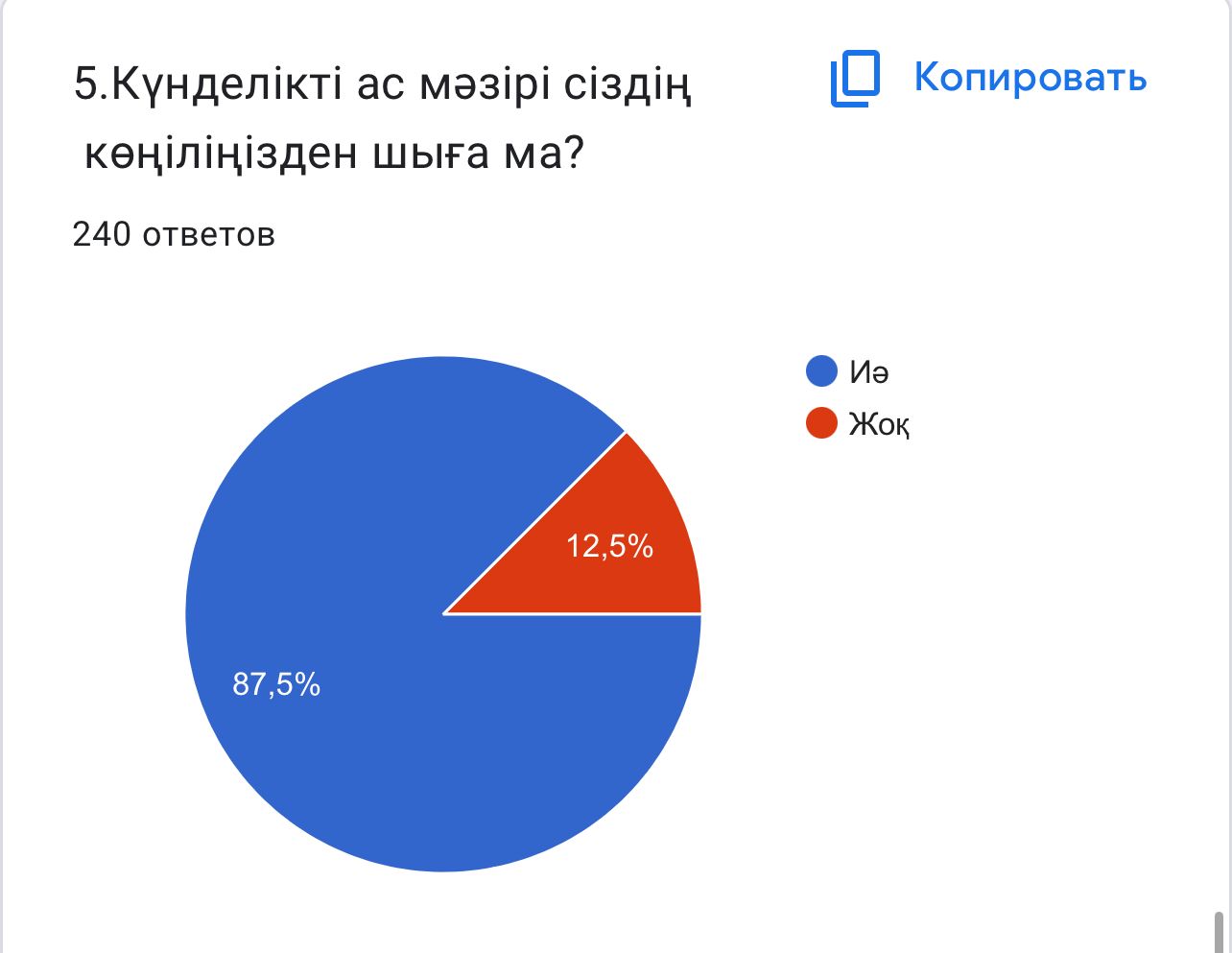 10 қараша 2023 0 1 2 3 4 5 «Бір мезгіл тегін ыстық тамақпен қамтылған» ата - аналармен жүргізілген сауалнаманың қорытындысы
