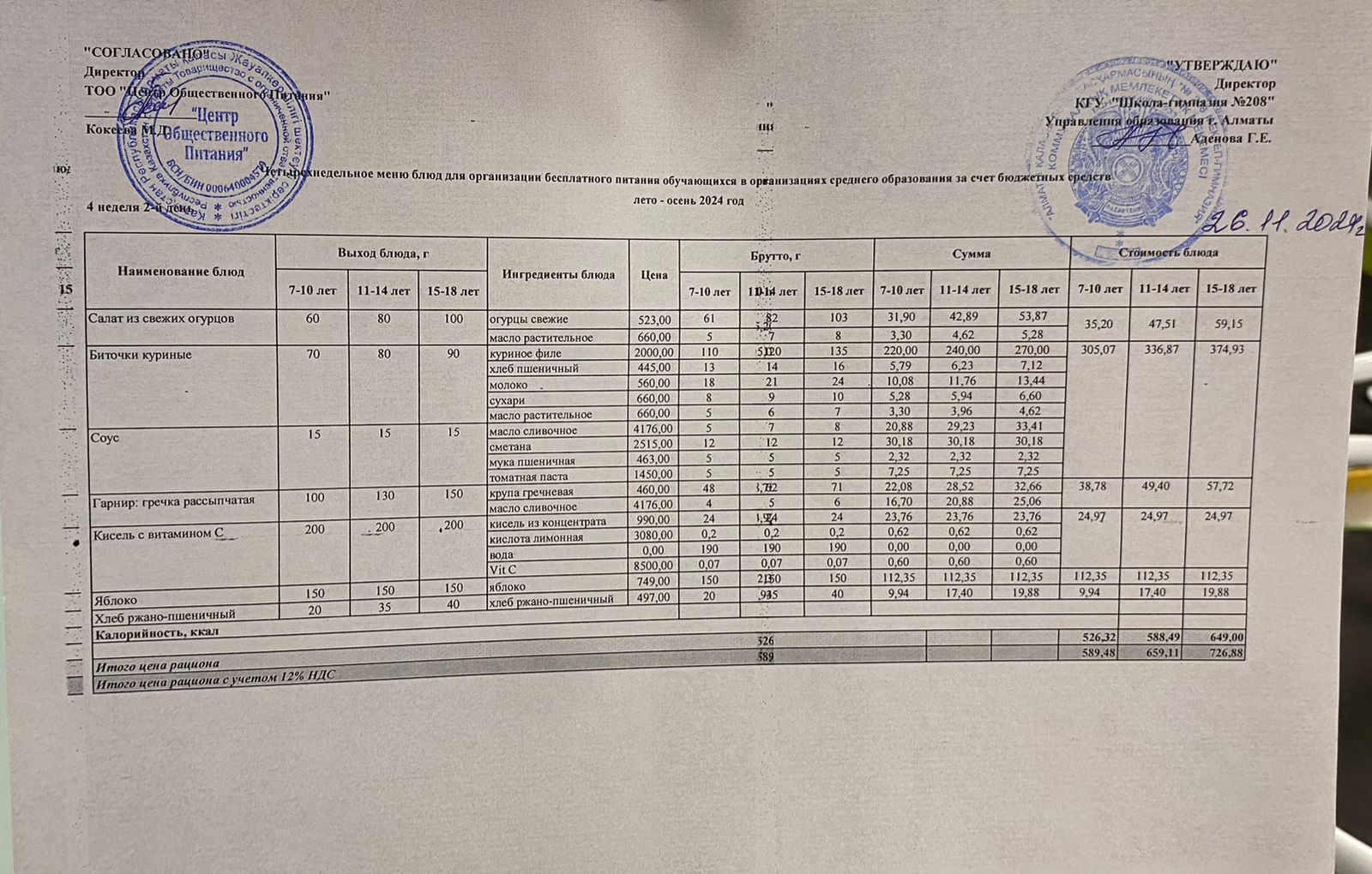 26.11.2024ж Асхана мәзірі » №208 мектеп-гимназия