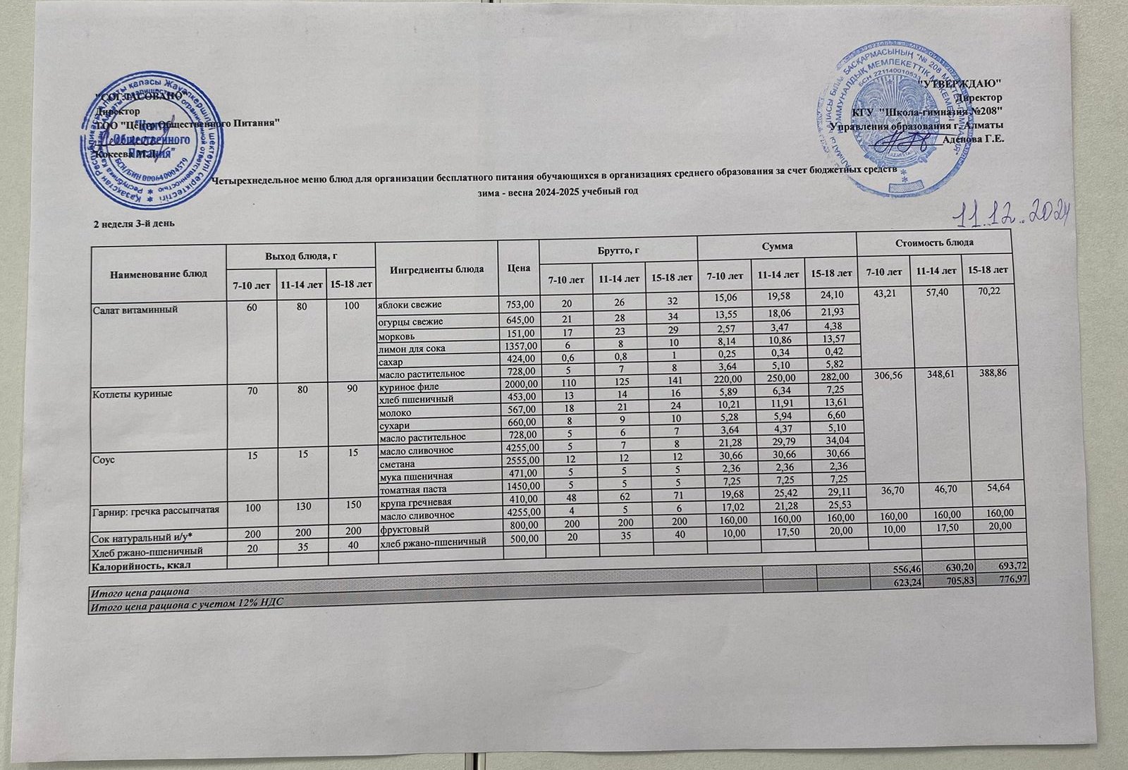 11.12.2024 Асхана мәзірі » №208 мектеп-гимназия