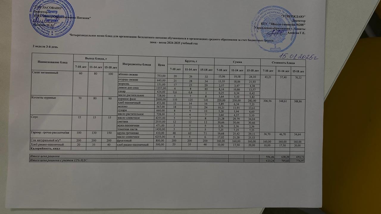 15.01.2025 Асхана мәзірі » №208 мектеп-гимназия