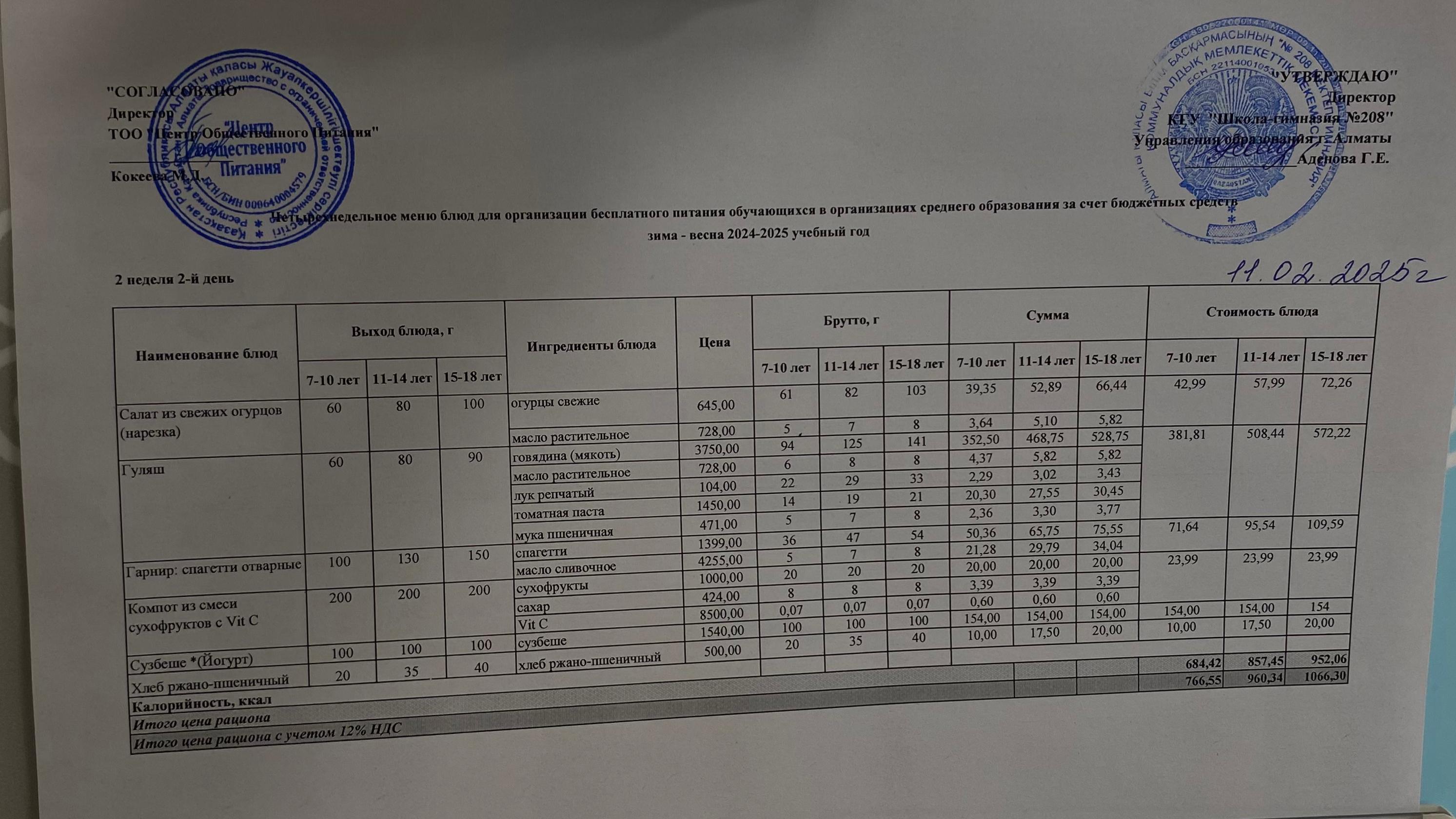 11.02.2025 Асхана мәзірі » №208 мектеп-гимназия