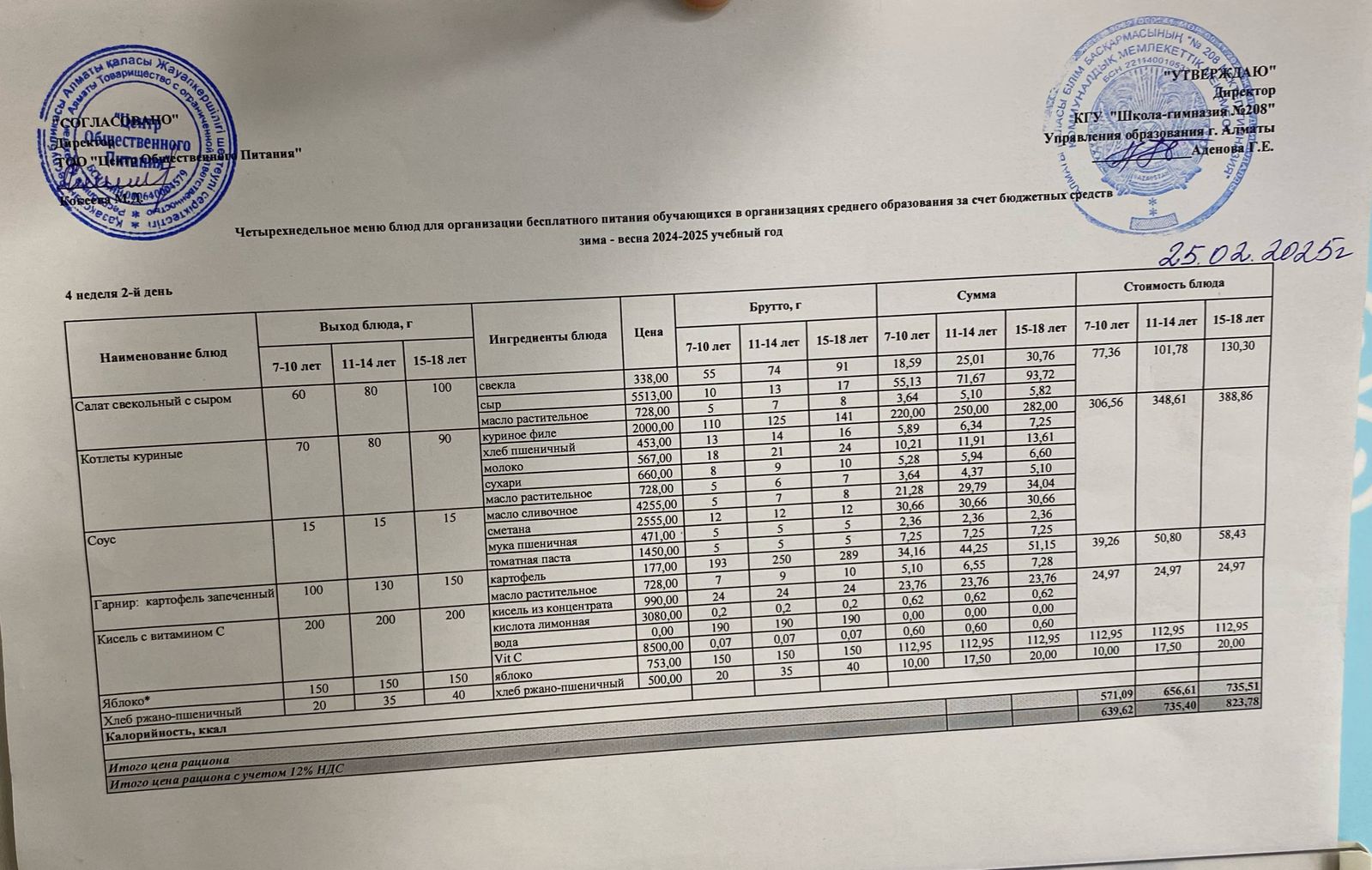25.02.2025 Асхана мәзірі » №208 мектеп-гимназия