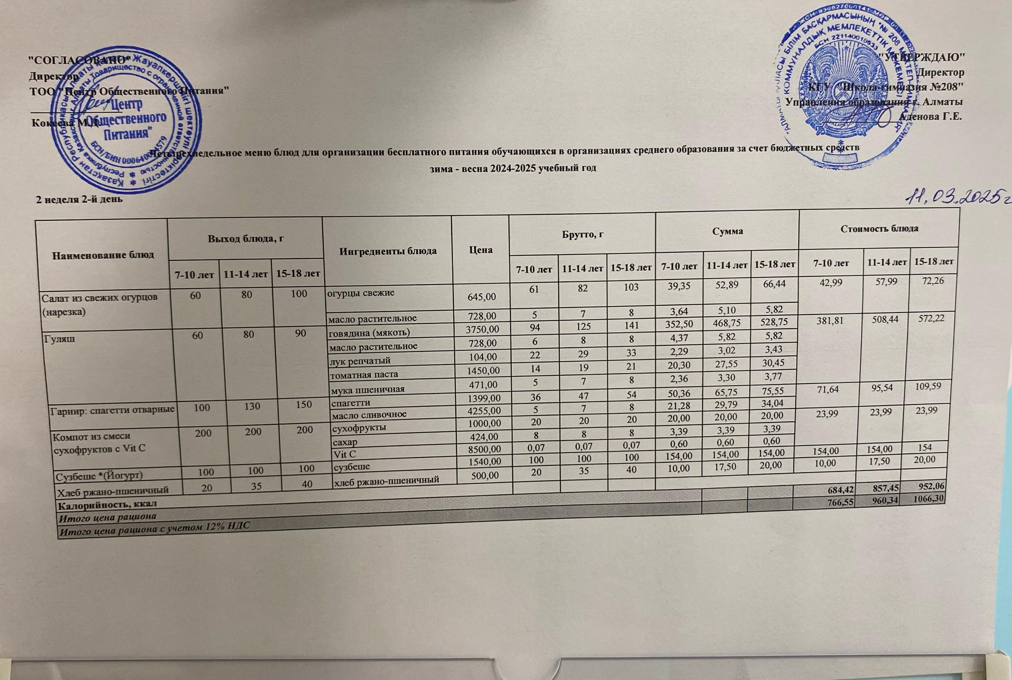 11.03.2025 Асхана мәзірі » №208 мектеп-гимназия