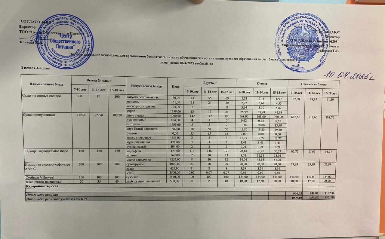 10.04.2025 Асхана мәзірі » №208 мектеп-гимназия